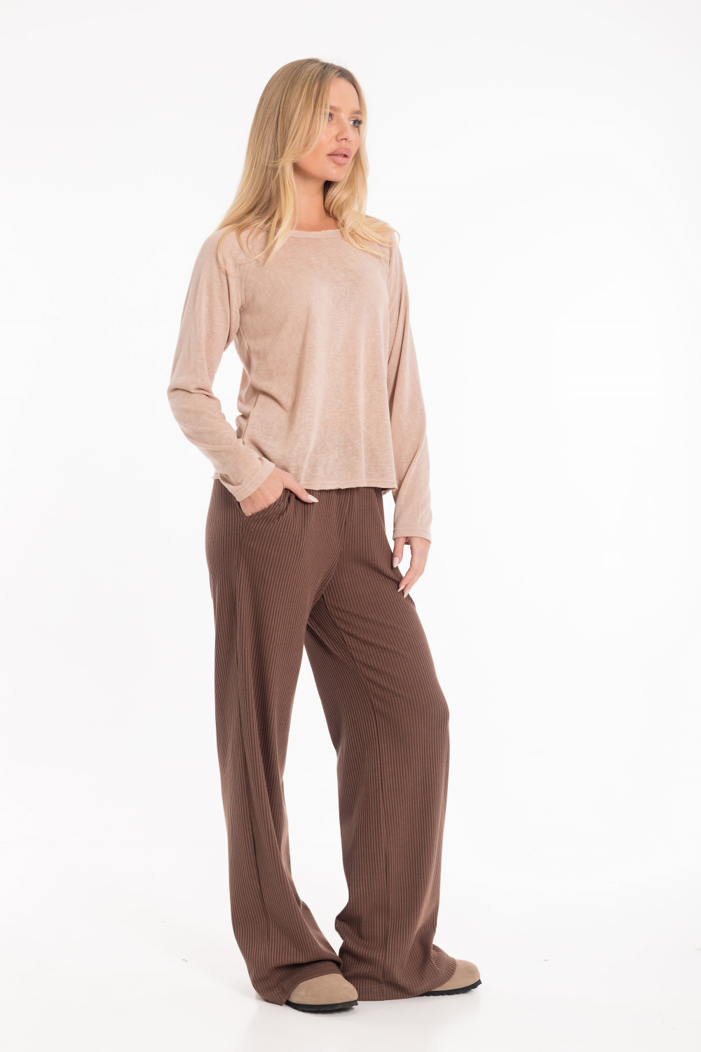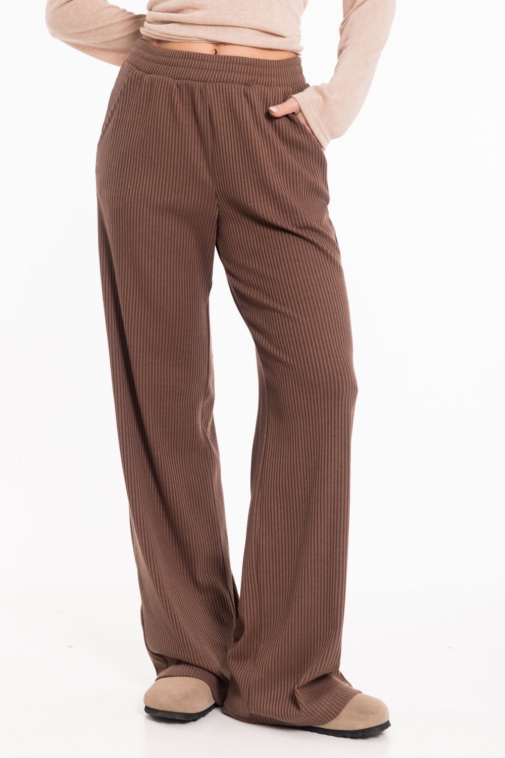Женские брюки выполнены из однотонного синтетического полотна "лапша". Силуэт свободный, пояс на резинке, по бокам размещены карманы.