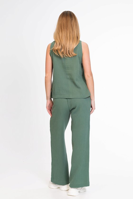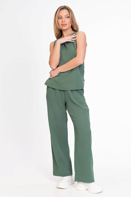 Женские брюки — отличный выбор для повседневной носки. Они изготовлены из лёгкого и практичного материала — муслина. Свободный крой не сковывает движений, а боковые карманы всегда будут под рукой. Пояс на резинке обеспечивает комфортную посадку. Брюки идеально подойдут для прогулок, отдыха или неформальных мероприятий. Брюки выполнены в однотонном цвете, что позволяет сочетать их с различными элементами гардероба.