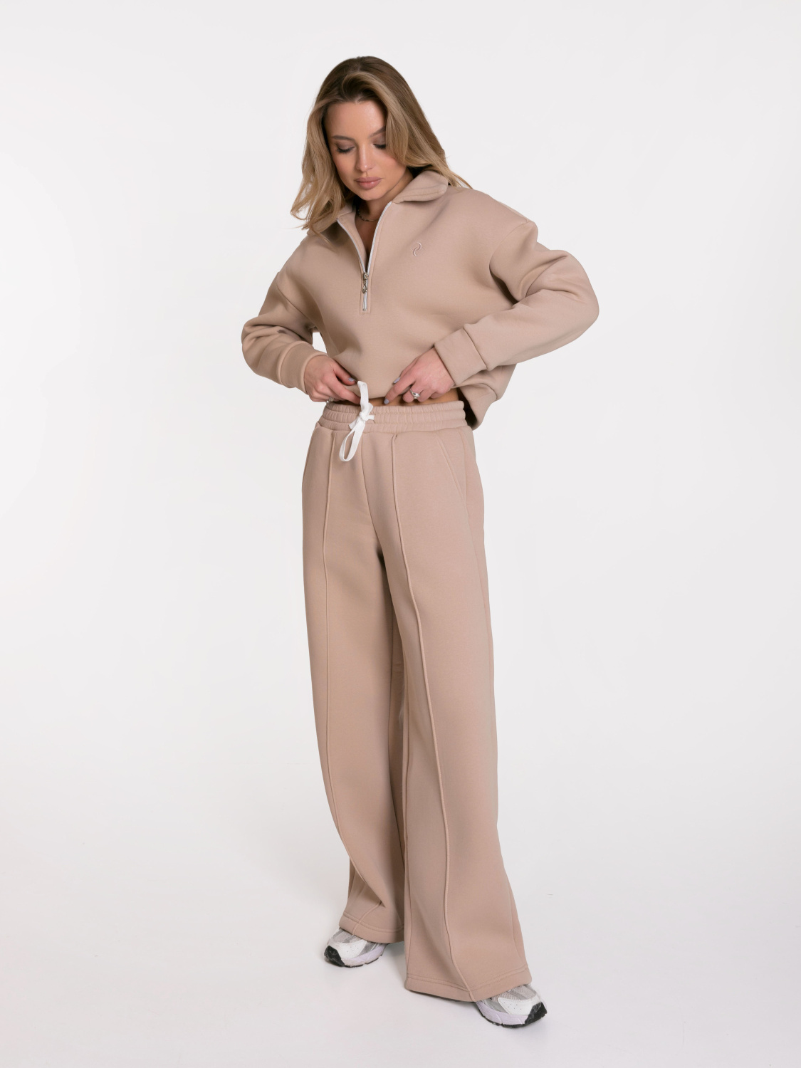 Женские брюки выполнены из полотна с начесом. Модель с декоративной отстрочкой в виде стрелок спереди. Удобный пояс на резинке со шнуром обеспечивает идеальную посадку. Практичные боковые карманы. Универсальная модель для создания стильных повседневных образов.