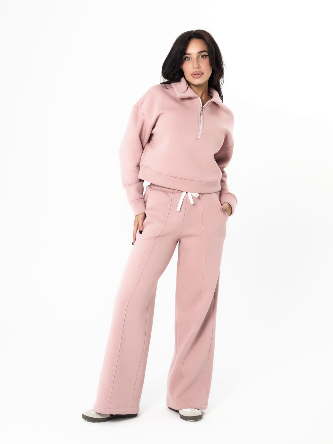 Женские брюки выполнены из полотна с начесом. Модель с декоративной отстрочкой в виде стрелок спереди. Удобный пояс на резинке со шнуром обеспечивает идеальную посадку. Практичные боковые карманы. Универсальная модель для создания стильных повседневных образов.