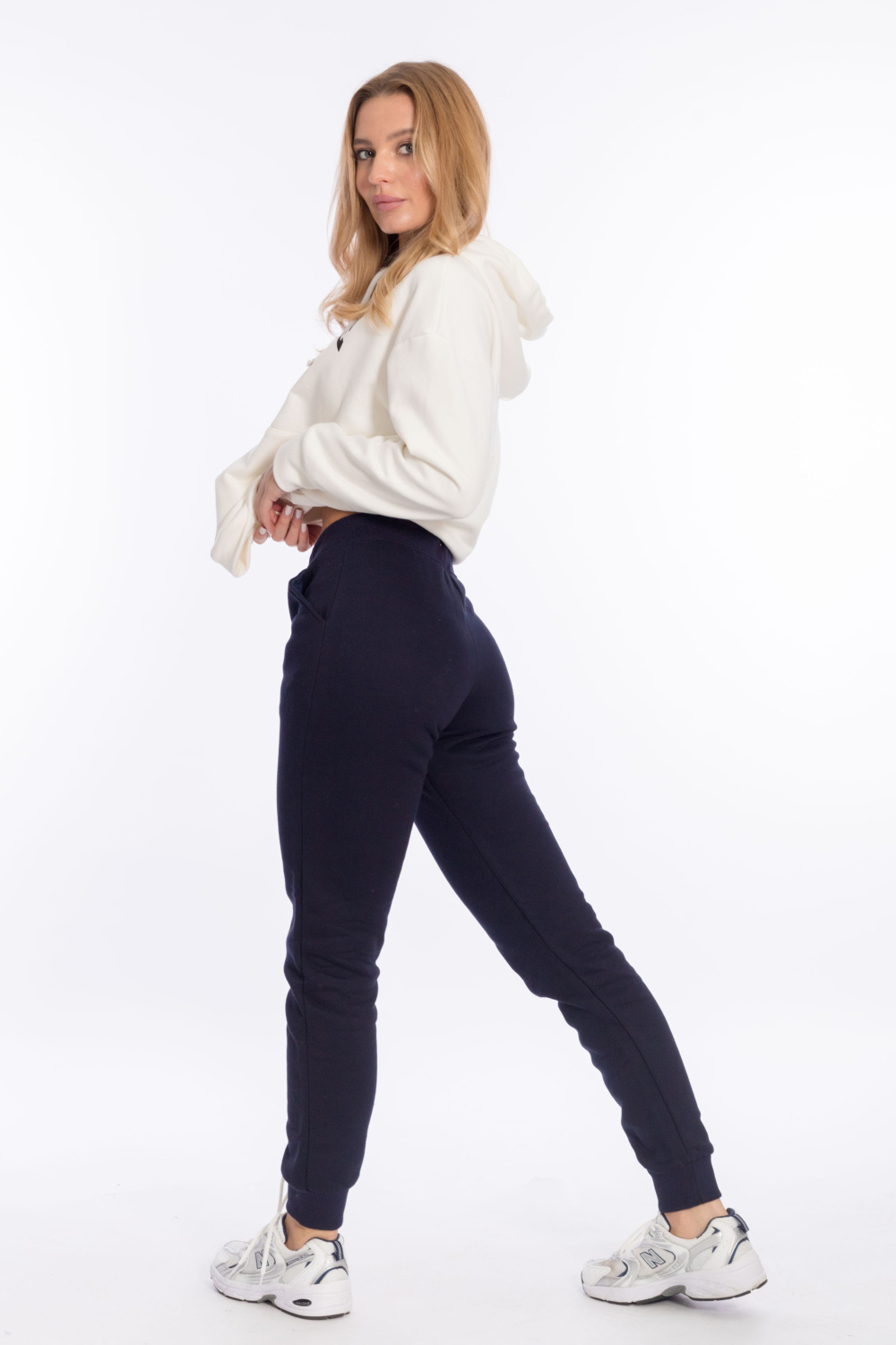 Брюки женские из полотна с начёсом. Низ брюк на манжетах, пояс на резине со шнуром, по бокам расположены карманы.