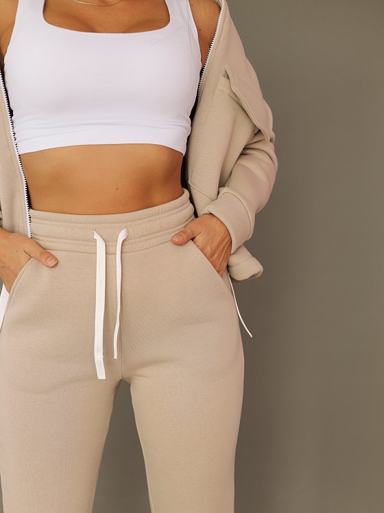 Женские брюки выполнены из полотна с начесом. Модель с боковыми карманами для практичности. Эластичный пояс со шнуром обеспечивает идеальную посадку по фигуре. Декоративные вытачки по низу брючин добавляют модели элегантности и визуальной легкости. Уютная и стильная модель для повседневной носки и отдыха.