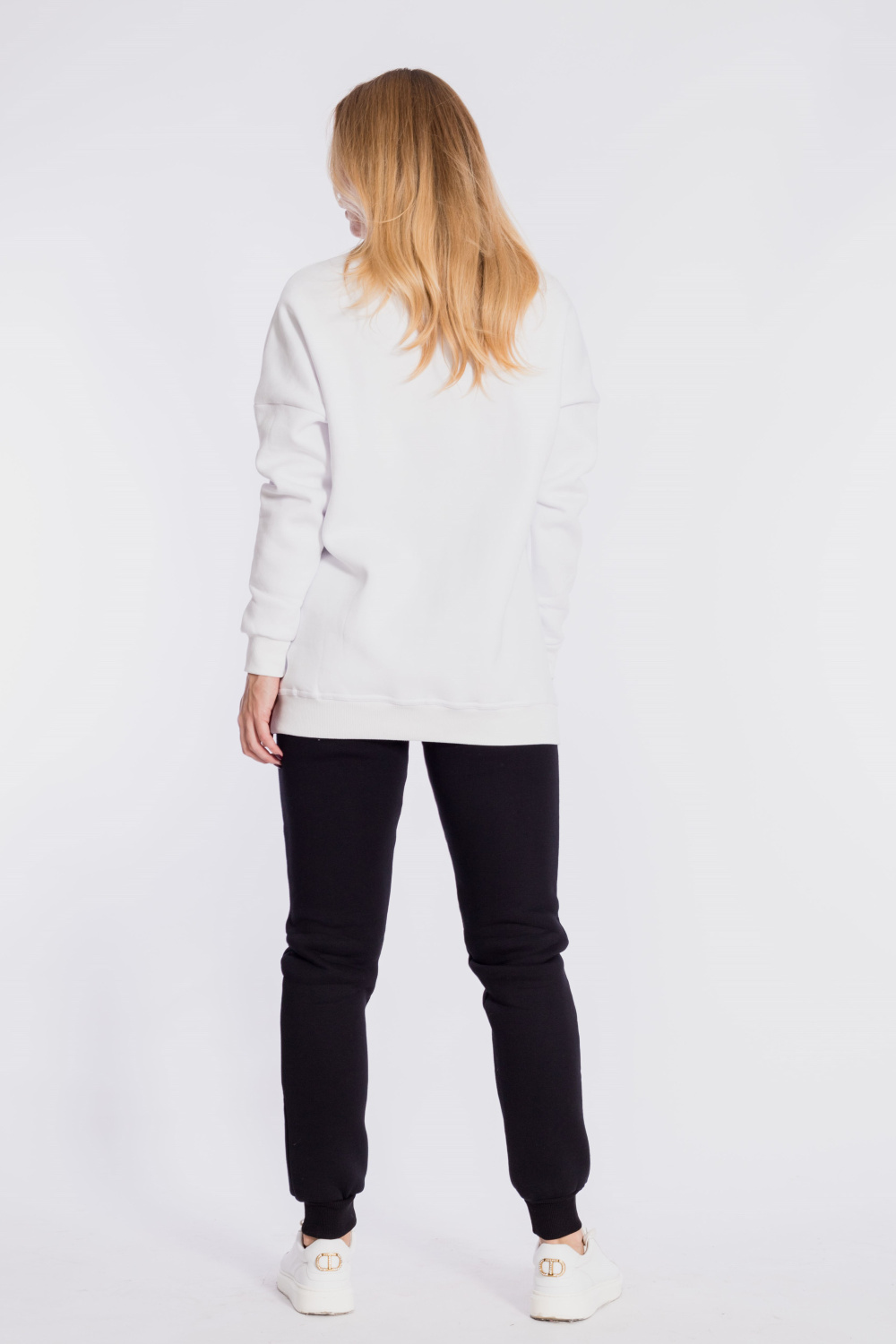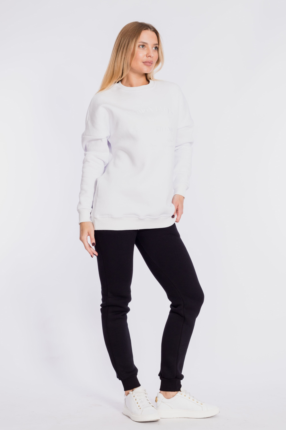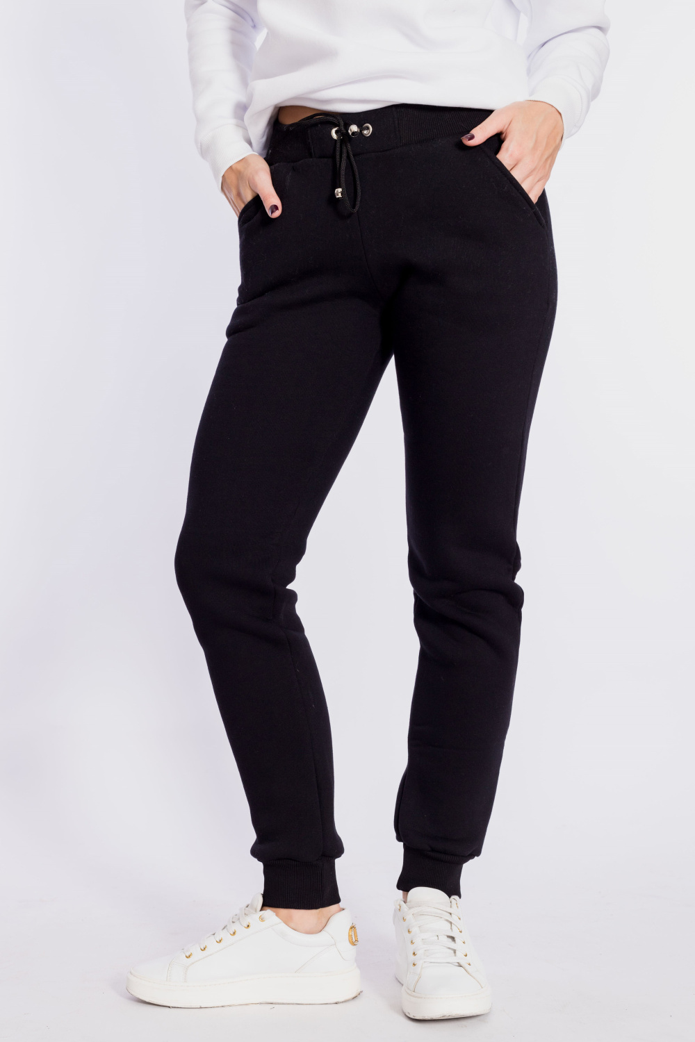 Брюки женские из полотна с начёсом. Низ брюк на манжетах, пояс на резине со шнуром, по бокам расположены карманы.