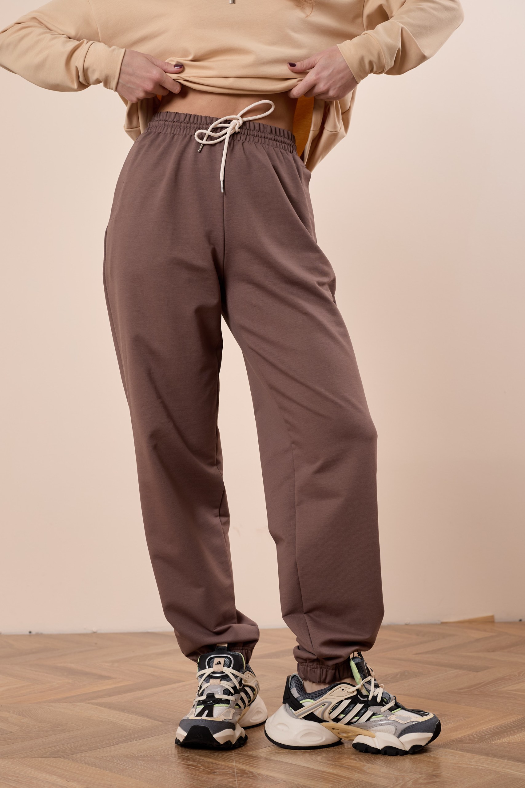 Брюки трикотажные, свободного кроя, с цельнокроеным поясом