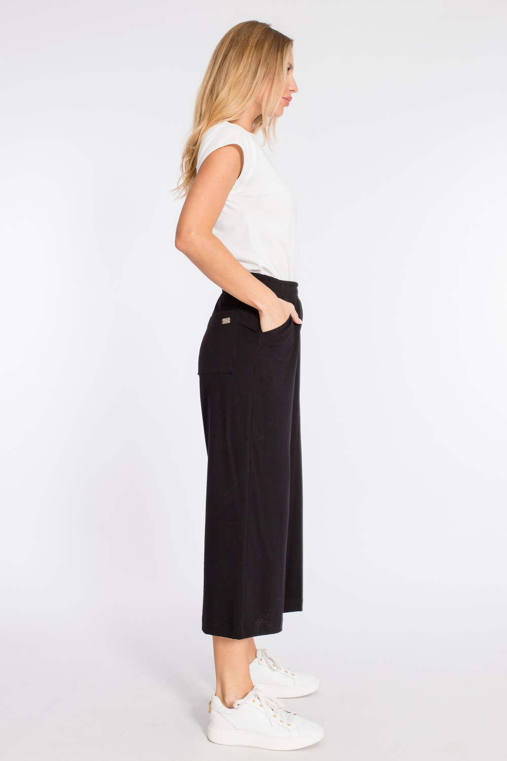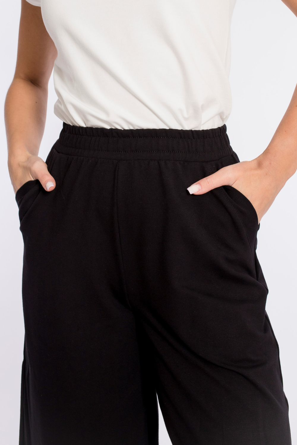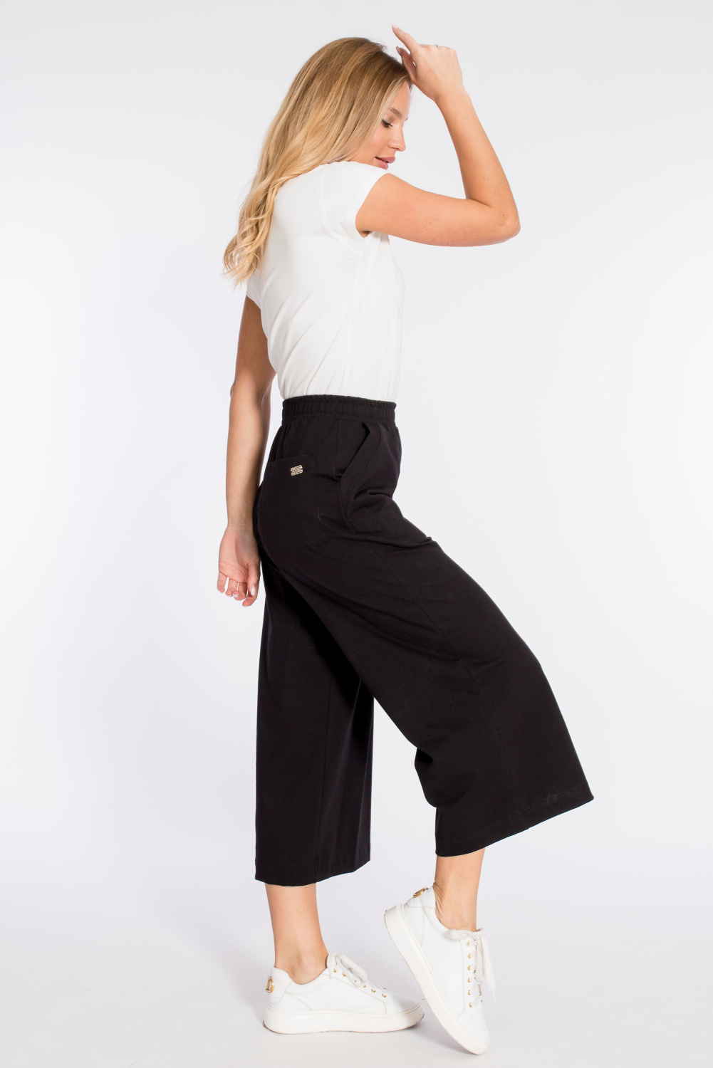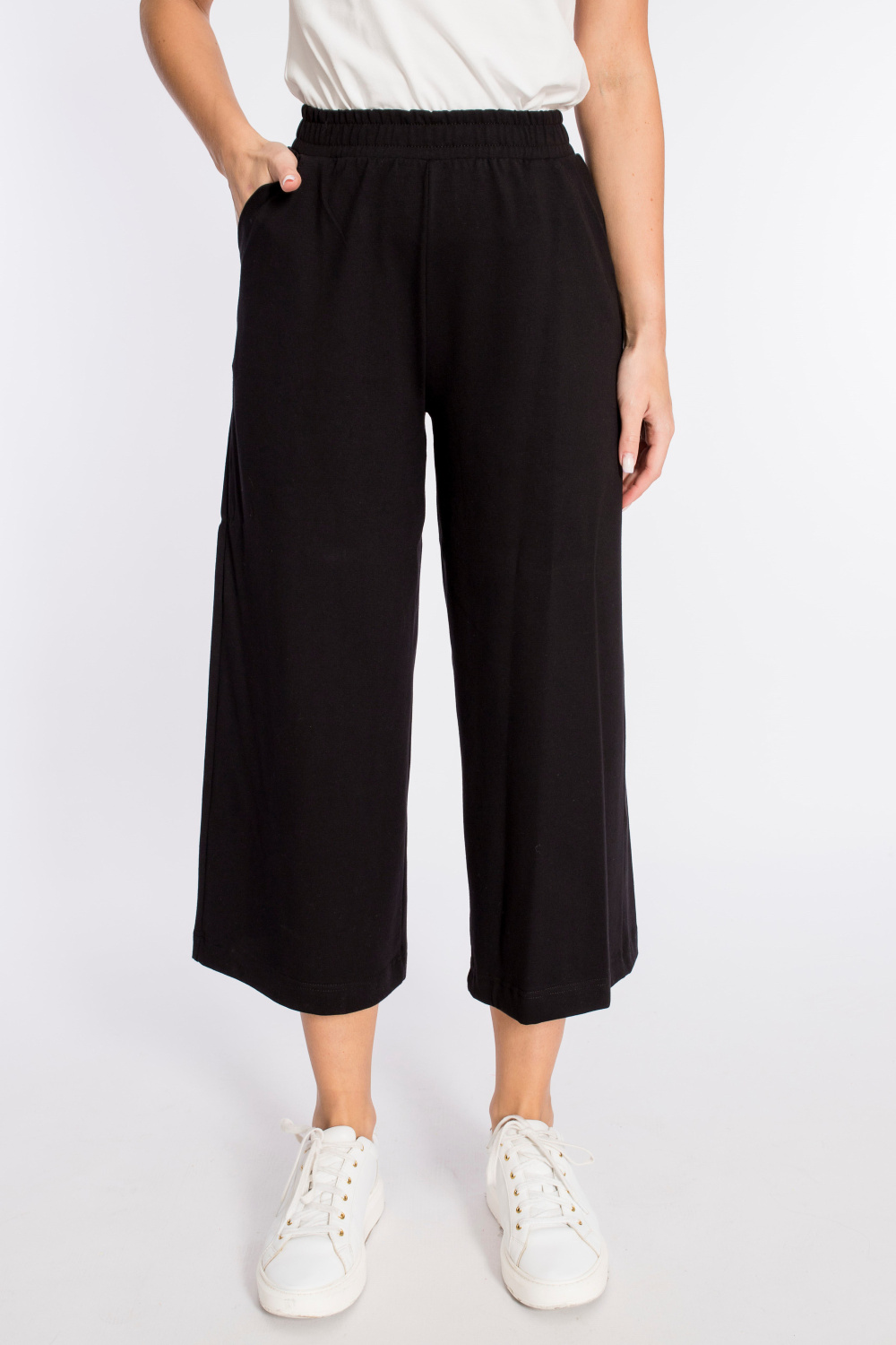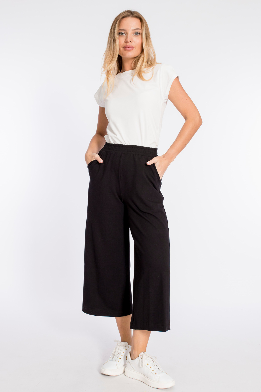 Кюлоты выполнены из кулирки с лайкрой. Силуэт брюк широкий, свободный. Пояс на резине, спереди и сзади размещено по два кармана.