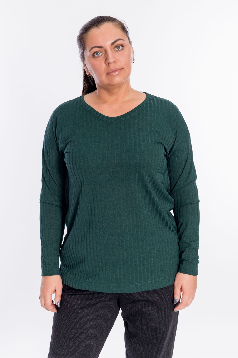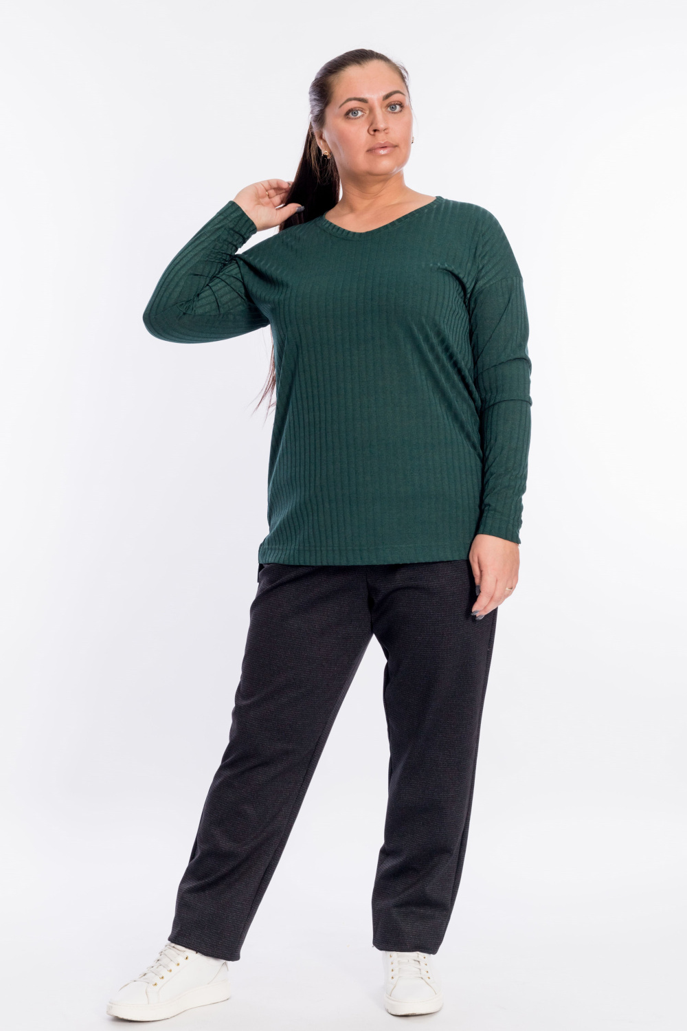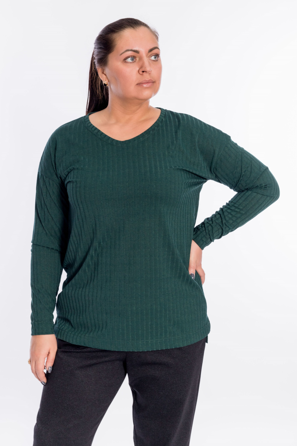 Джемпер выполнен из рибаны в крупный рубчик. Рукав длинный, со спущенной проймой. Вырез мягкий, V-образный. Спинка длиннее переда, по бокам небольшие разрезы.