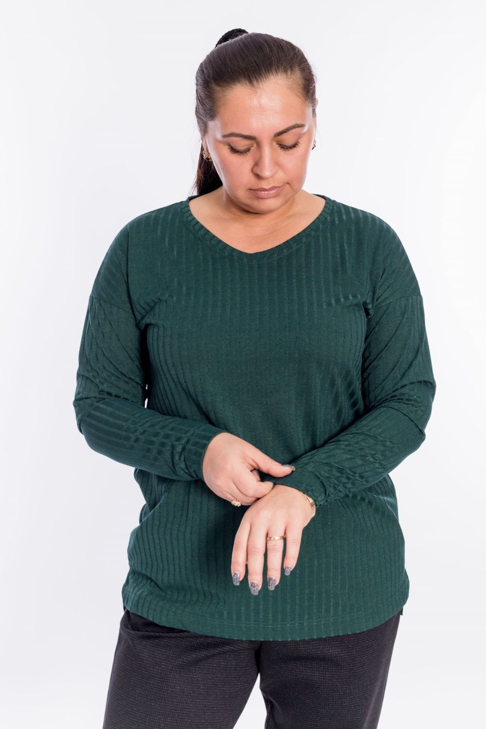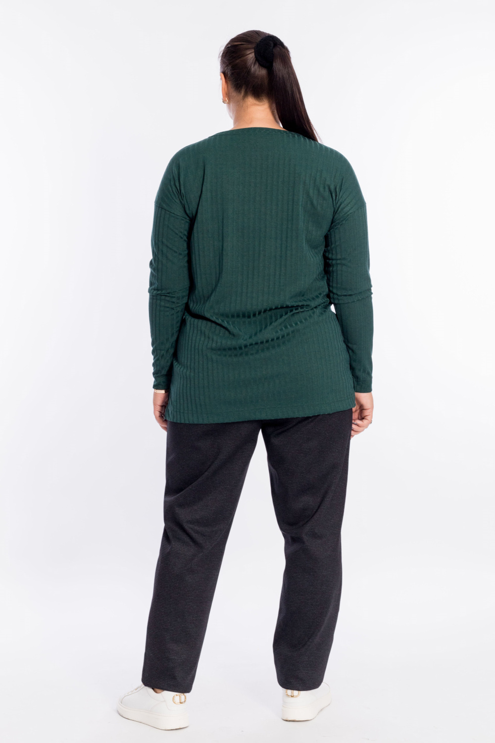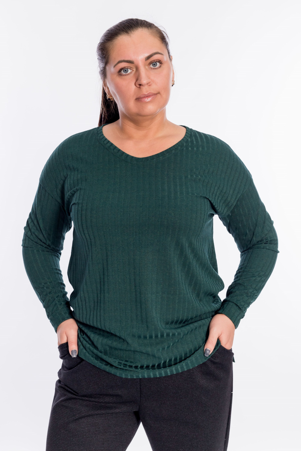 Джемпер выполнен из рибаны в крупный рубчик. Рукав длинный, со спущенной проймой. Вырез мягкий, V-образный. Спинка длиннее переда, по бокам небольшие разрезы.