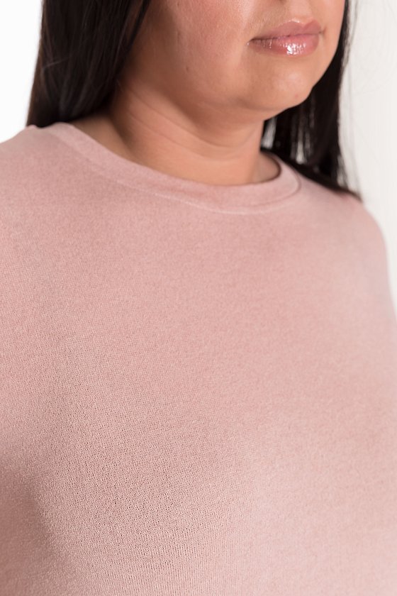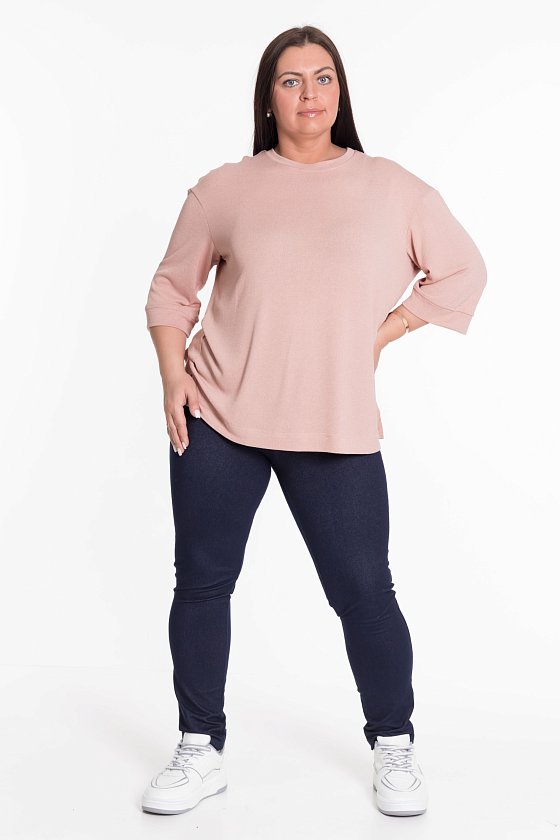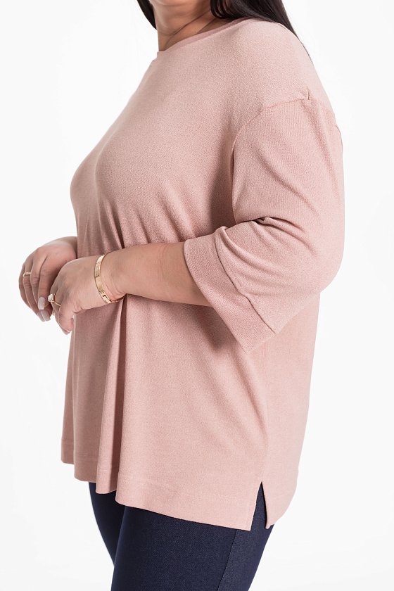 Однотонный джемпер из вязаного трикотажа с выточками по бокам и спущенным рукавом — удобная и стильная вещь для повседневного гардероба. Длина рукава 3/4 обеспечивает комфорт, а свободный крой не сковывает движений. Горловина и нижние срезы рукавов обработаны притачными планками, что придаёт изделию аккуратный вид.
