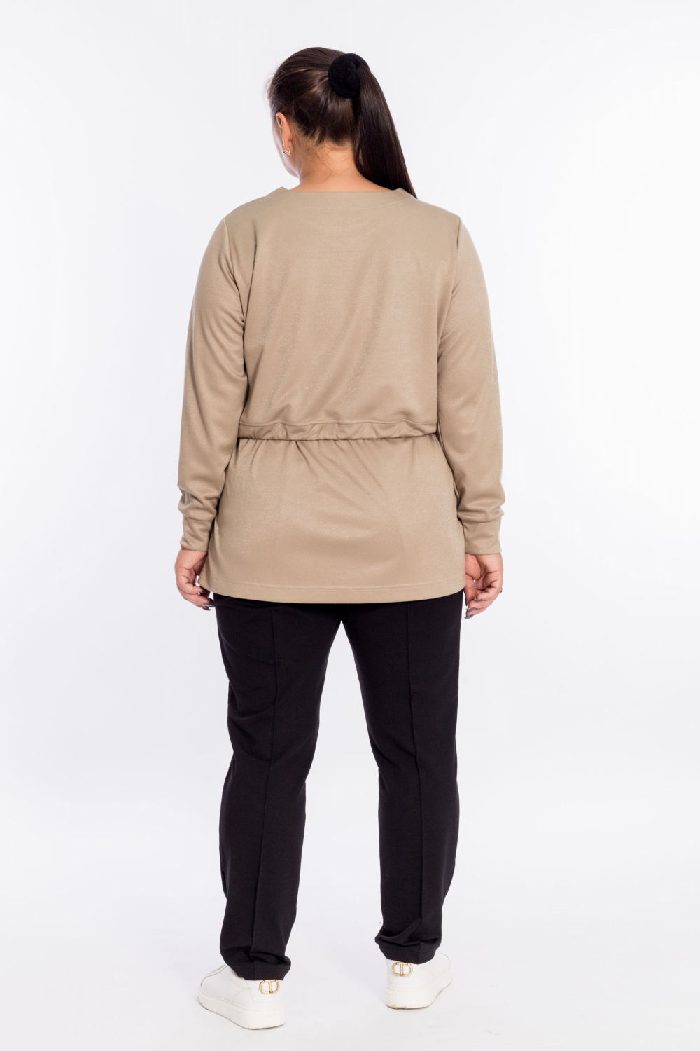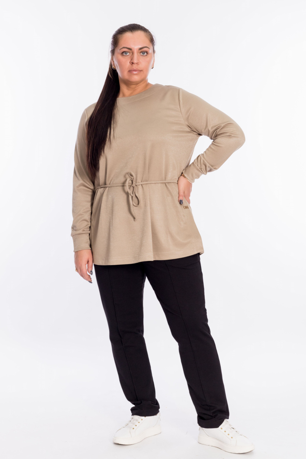 Джемпер выполнен из полотна "академик" с люрексом. С длинным втачным рукавом. Сзади по талии кулиска для шнура. По бокам разрезы с втачными планками.