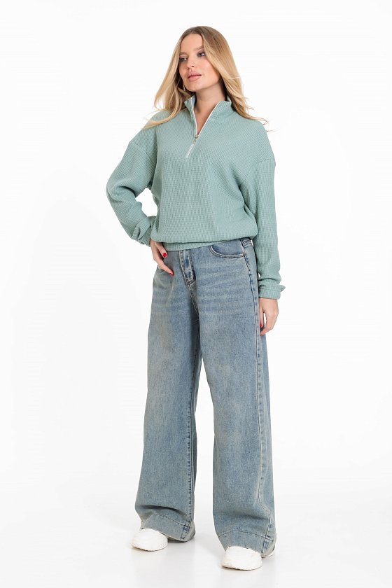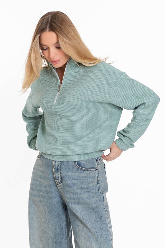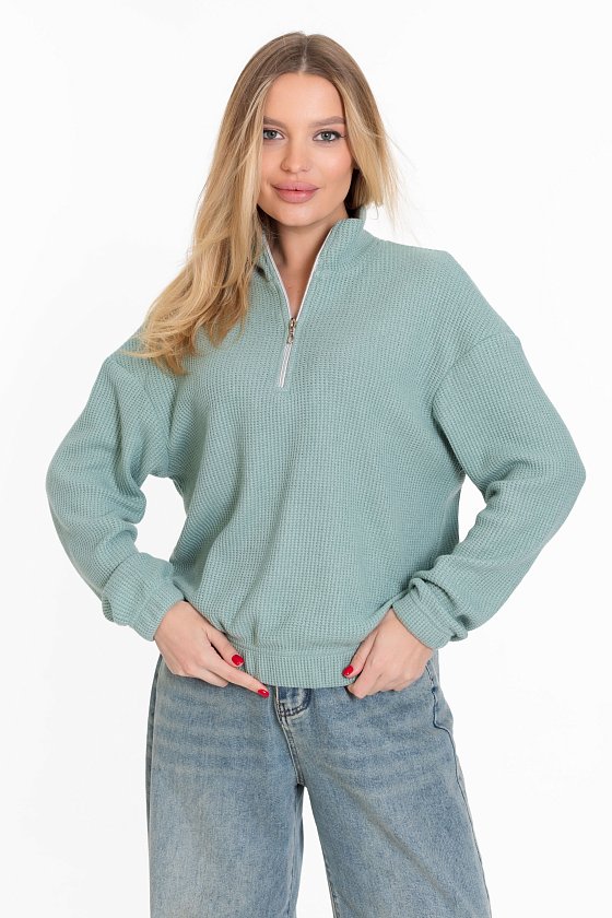 Женский джемпер выполнен из мягкого и тёплого вязаного полотна цвета ментол. Эта модель имеет спущенную линию плеча, что придаёт изделию оригинальность и свободу движений. Воротник-стойка с застёжкой на молнию обеспечивает дополнительный комфорт, а резинка по низу джемпера гарантирует удобную посадку и сохраняет тепло. Такой джемпер станет стильным элементом вашего гардероба и подойдёт для создания разнообразных образов.