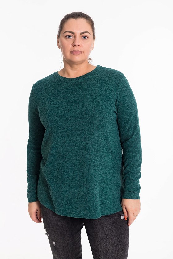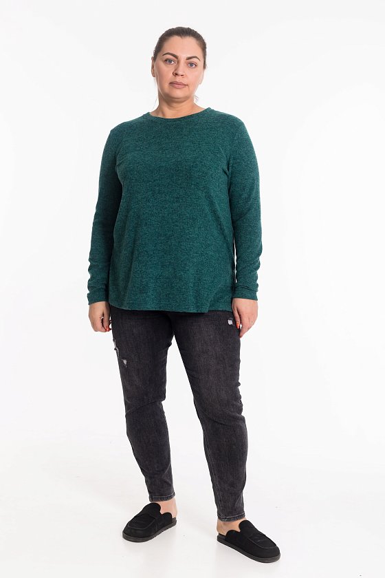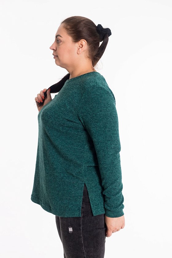 Джемпер полуприлегающего силуэта выполнен из нежной ангоры в цвете изумруд. Модель с втачными рукавами и элегантной планкой по горловине. Боковые разрезы добавляют образу легкости и динамики. Идеальное сочетание уютного тепла и изысканного стиля.