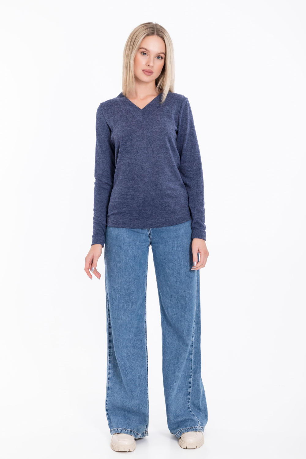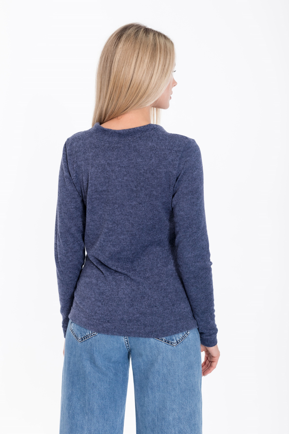 Джемпер выполнен из вязаного полотна ангорка в цвете индиго. Силуэт прилегающий. В шов планки V-образного выреза горловины вшит декоративный флажок.