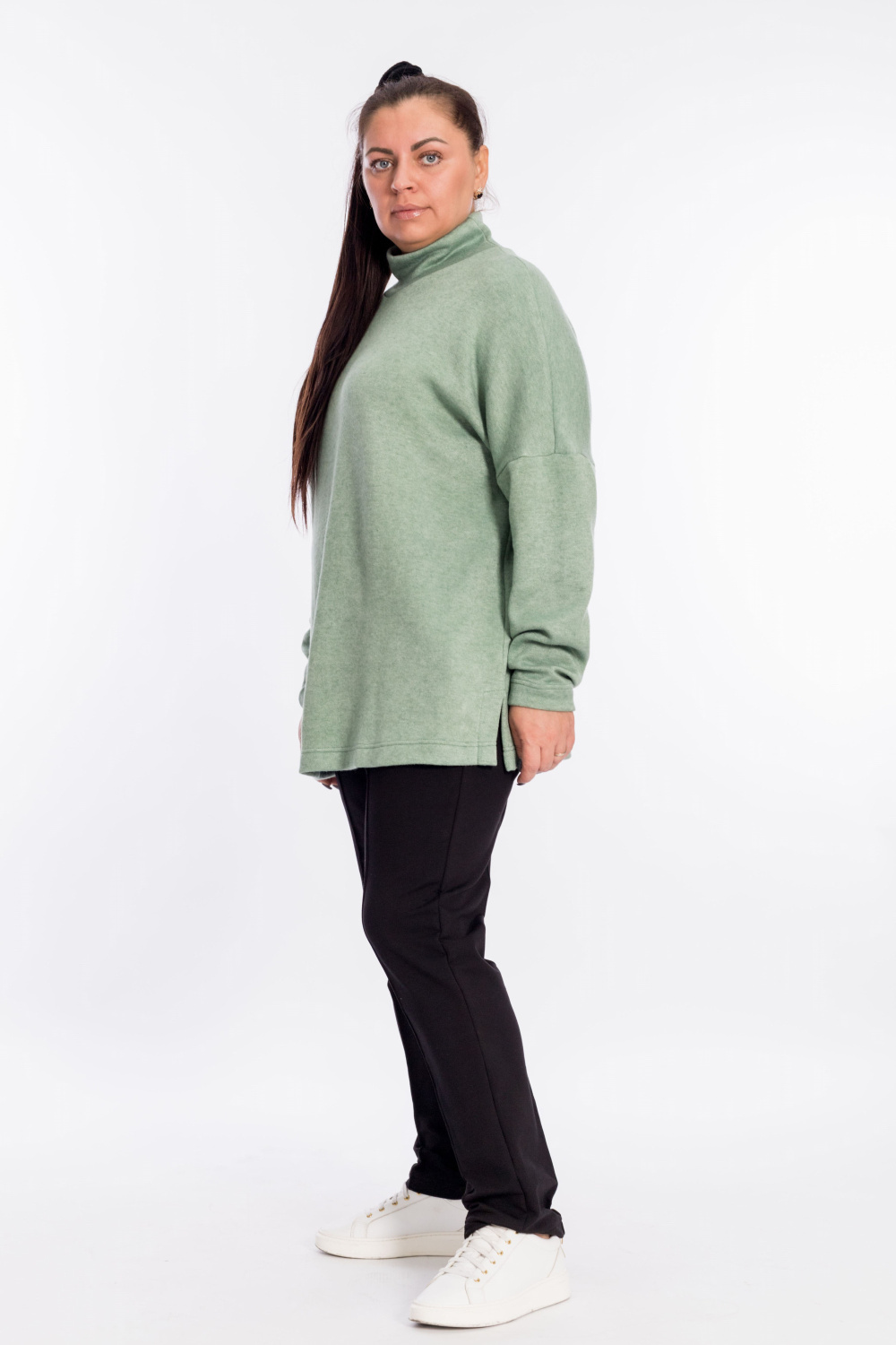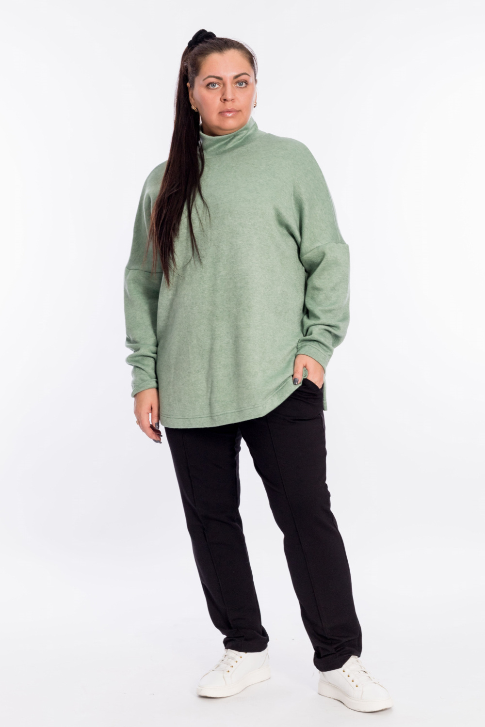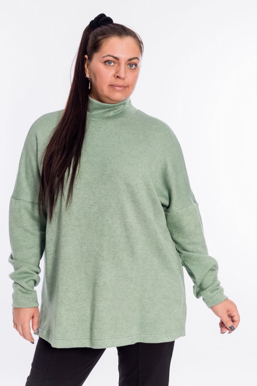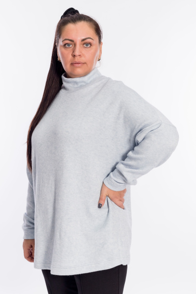 Женский джемпер с высоким воротником выполнен из полотна "ангорка". Силуэт свободный, линия плеч спущена, внизу, по бокам изделия декоративные разрезы. Невероятно мягкий и тёплый джемпер - идеальный выбор в прохладное время года, легко впишется в повседневный гардероб.