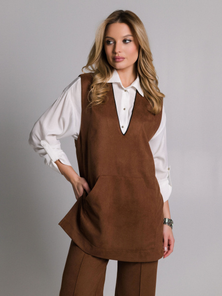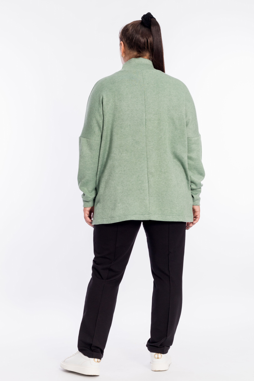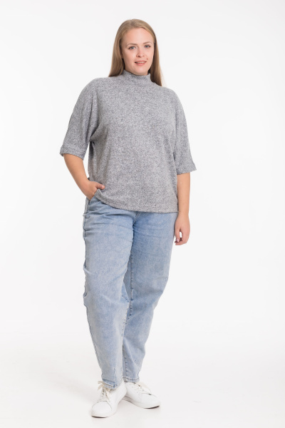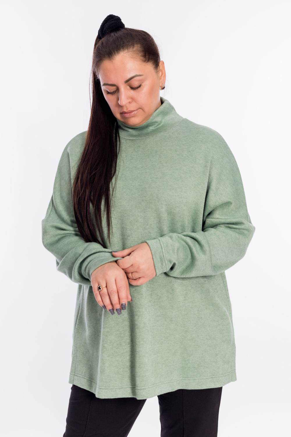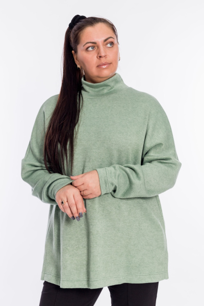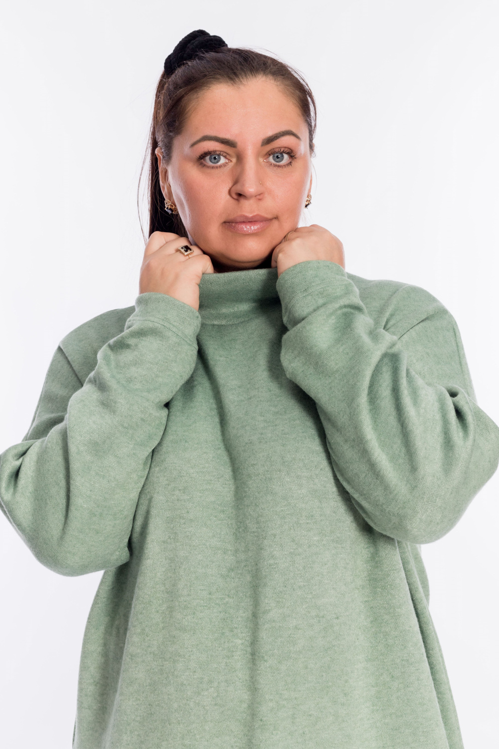 Женский джемпер с высоким воротником выполнен из полотна "ангорка". Силуэт свободный, линия плеч спущена, внизу, по бокам изделия декоративные разрезы. Невероятно мягкий и тёплый джемпер - идеальный выбор в прохладное время года, легко впишется в повседневный гардероб.
