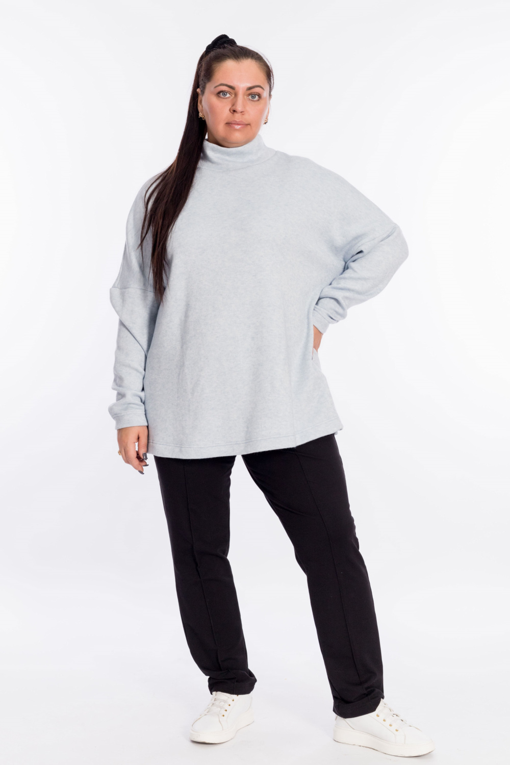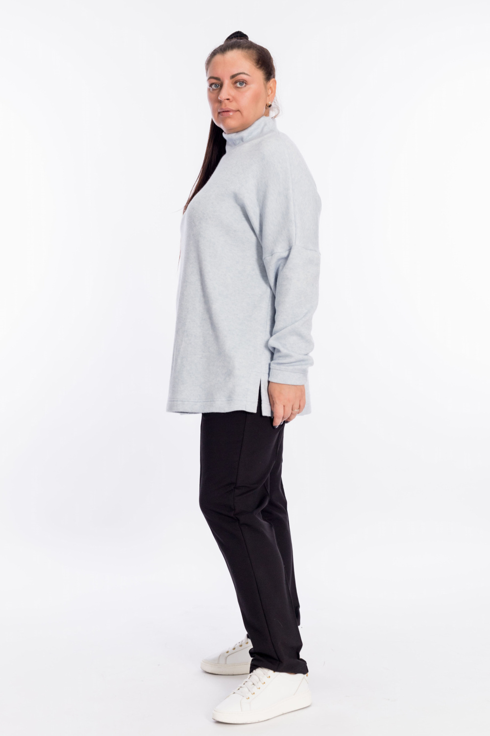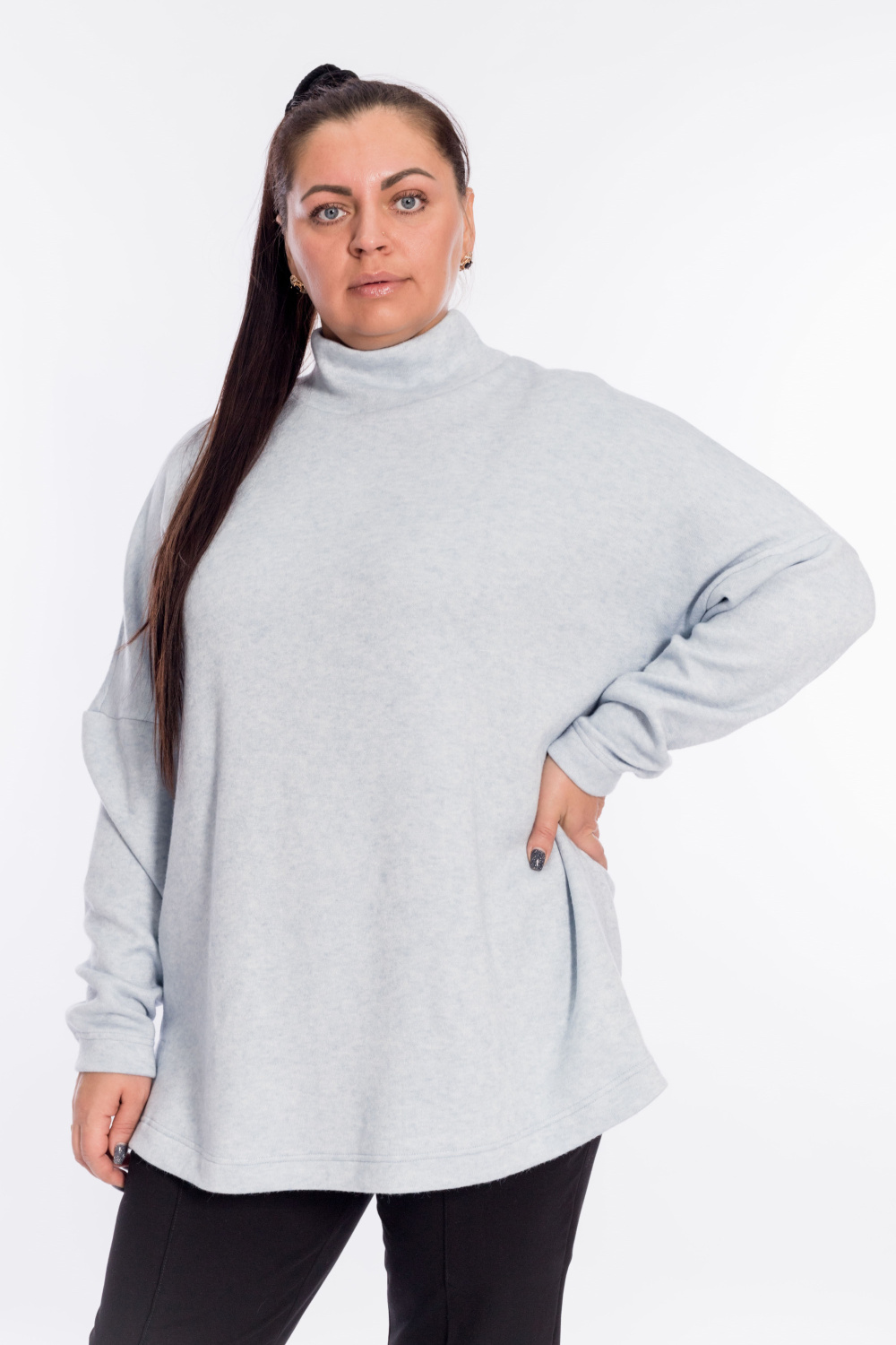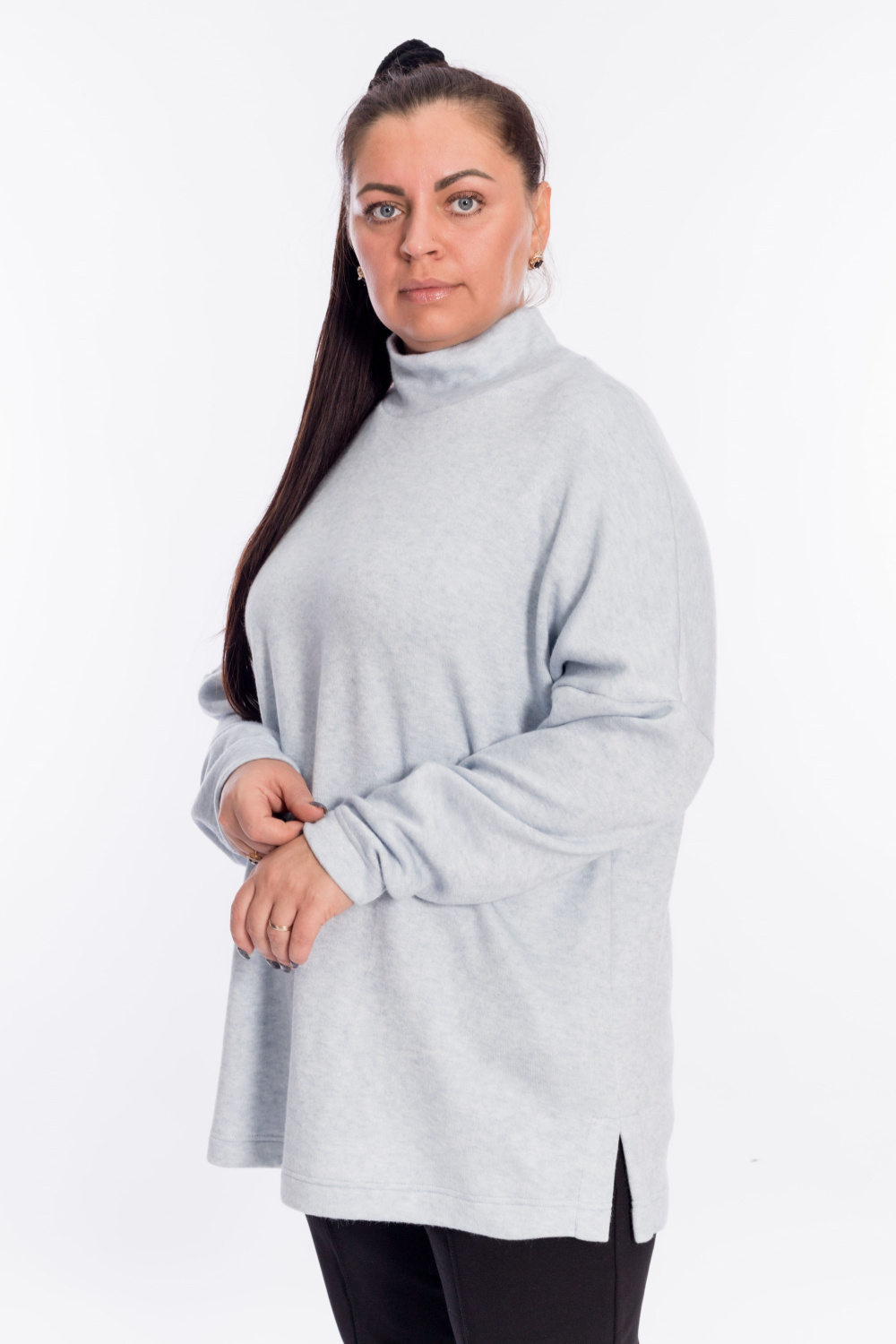 Женский джемпер с высоким воротником выполнен из полотна "ангорка". Силуэт свободный, линия плеч спущена, внизу, по бокам изделия декоративные разрезы. Невероятно мягкий и тёплый джемпер - идеальный выбор в прохладное время года, легко впишется в повседневный гардероб.