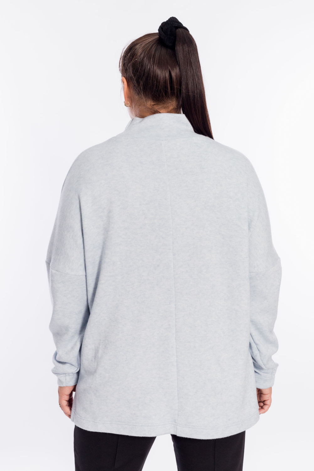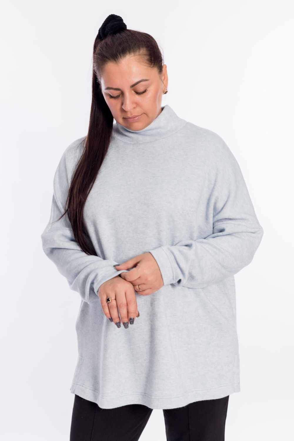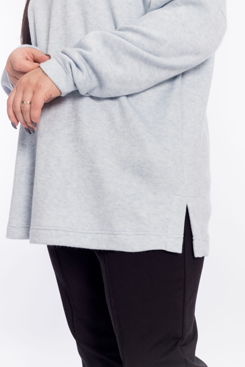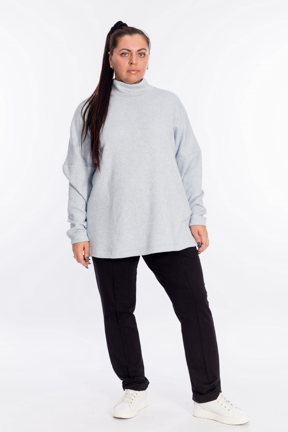 Женский джемпер с высоким воротником выполнен из полотна "ангорка". Силуэт свободный, линия плеч спущена, внизу, по бокам изделия декоративные разрезы. Невероятно мягкий и тёплый джемпер - идеальный выбор в прохладное время года, легко впишется в повседневный гардероб.
