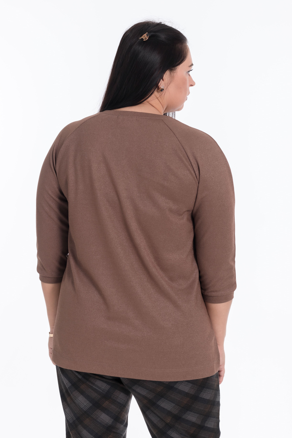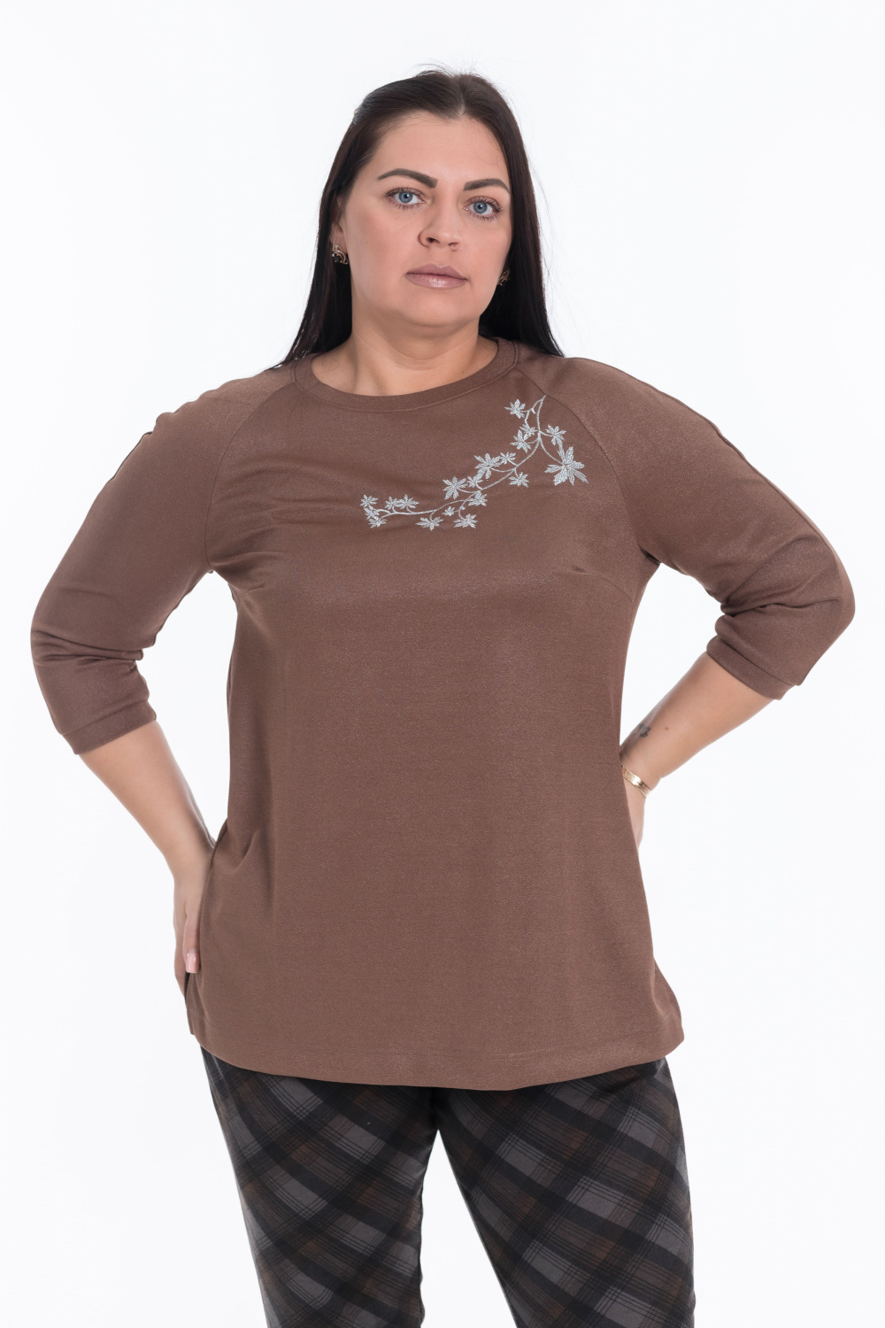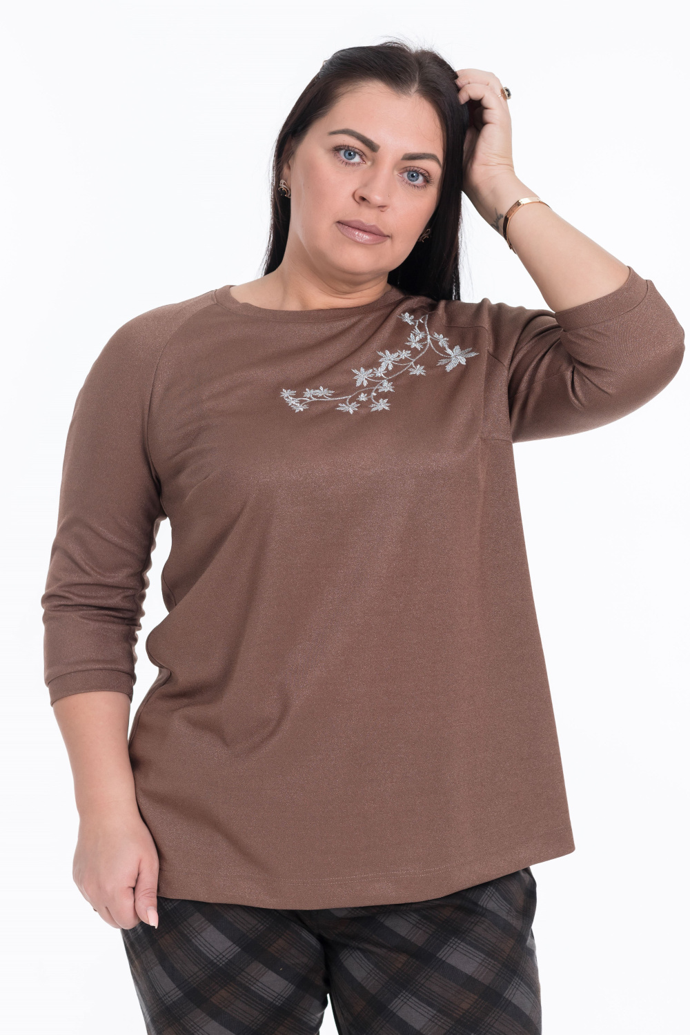 Коричневый джемпер свободного кроя с рукавами реглан и выточками по бокам — отличный выбор для создания уютного образа. Длина рукава 3/4 и круглый вырез горловины обеспечивают удобство, а вышивка на груди и материал с люрексом придают изысканность.