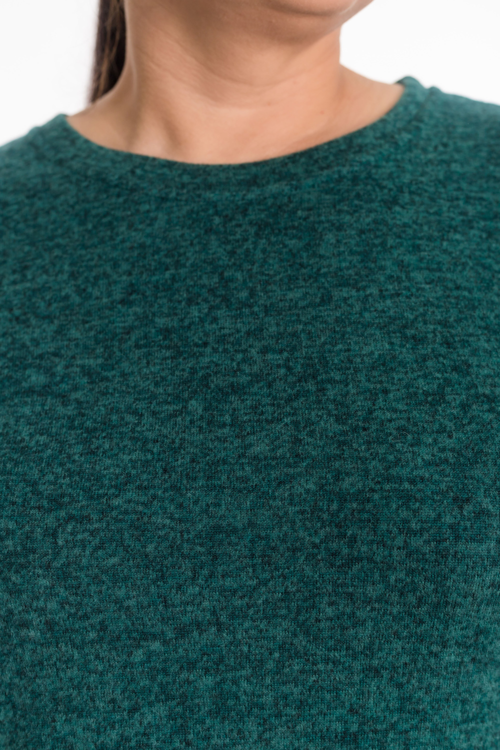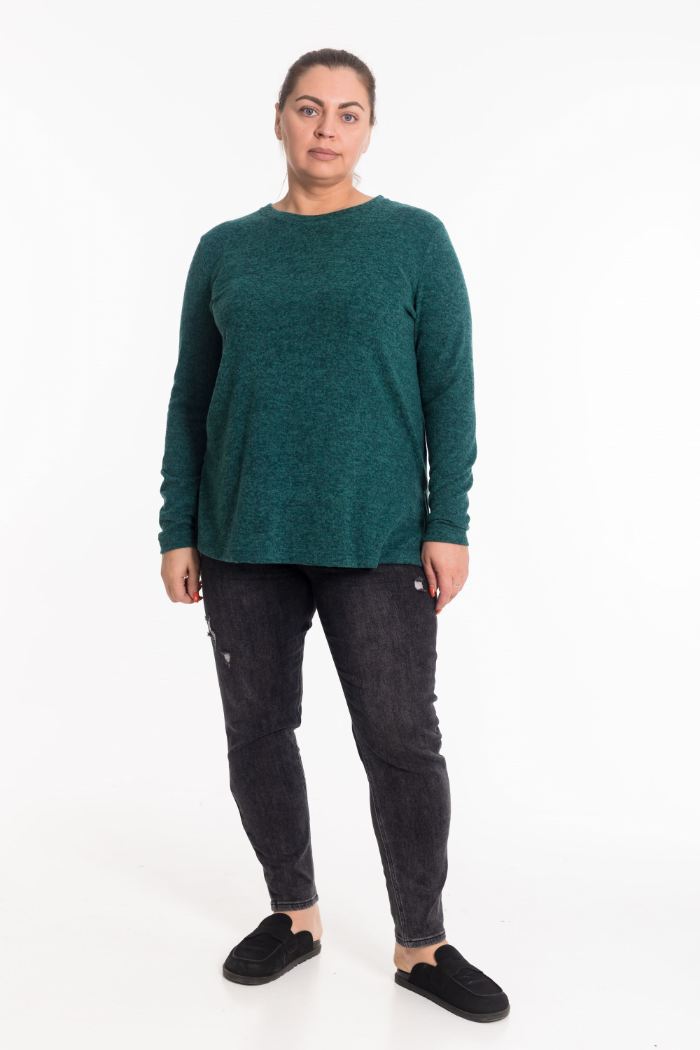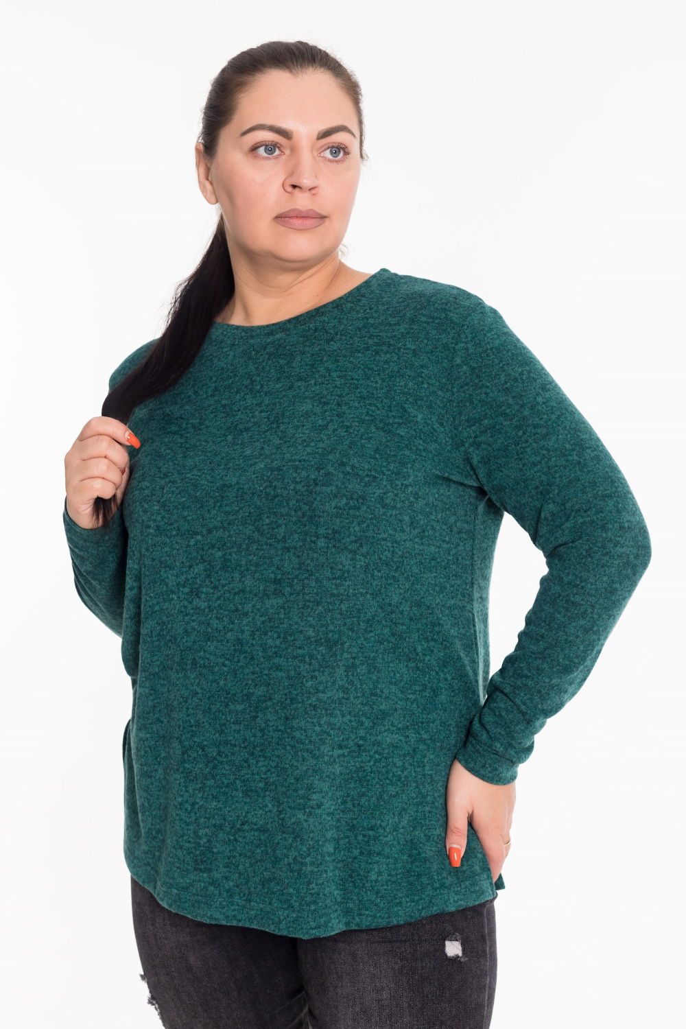 Джемпер полуприлегающего силуэта выполнен из нежной ангоры в цвете изумруд. Модель с втачными рукавами и элегантной планкой  по горловине. Боковые разрезы добавляют образу легкости и динамики. Идеальное сочетание уютного тепла и изысканного стиля.