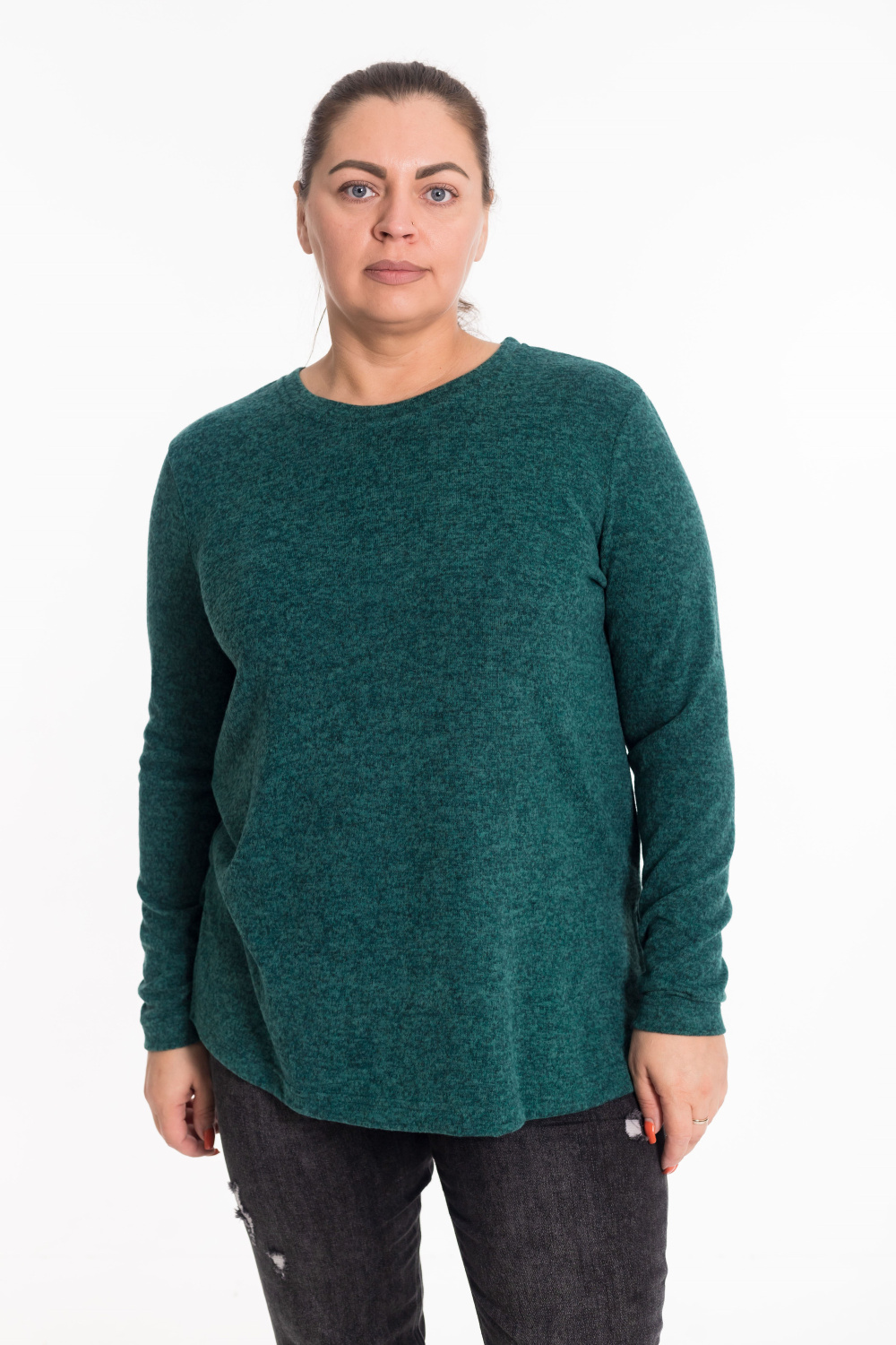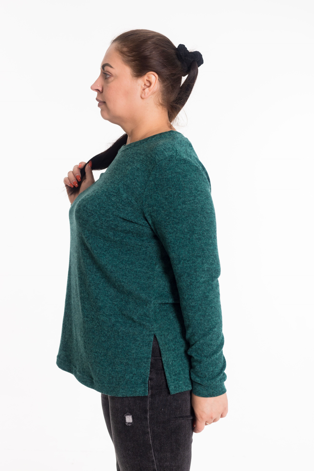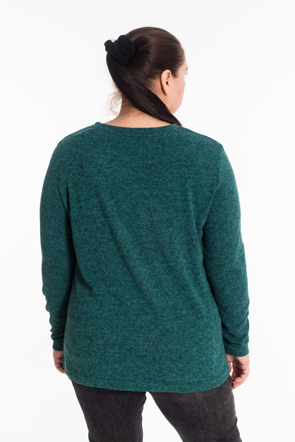 Джемпер полуприлегающего силуэта выполнен из нежной ангоры в цвете изумруд. Модель с втачными рукавами и элегантной планкой  по горловине. Боковые разрезы добавляют образу легкости и динамики. Идеальное сочетание уютного тепла и изысканного стиля.