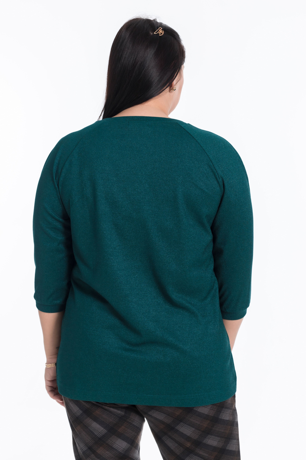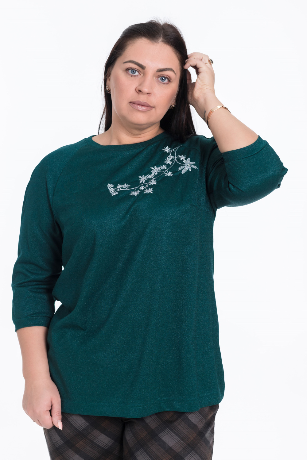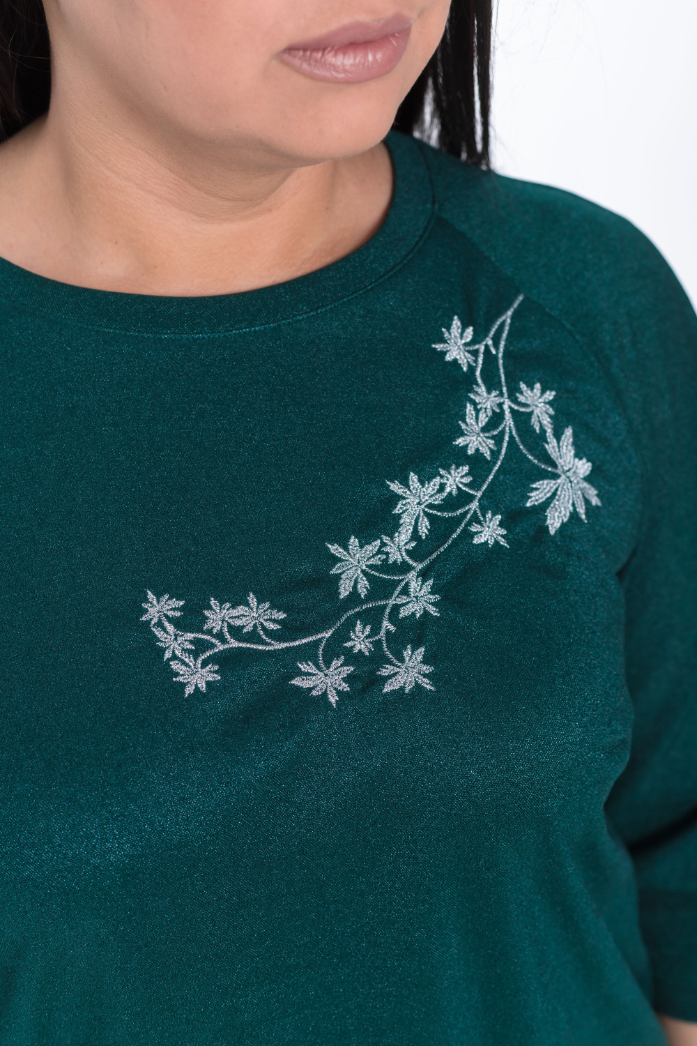 Зеленый джемпер свободного кроя с рукавами реглан и выточками по бокам — идеальный вариант для создания повседневного образа. Длина рукава 3/4 и круглый вырез горловины обеспечивают комфорт, а вышивка на груди и материал с люрексом добавляют изысканности.