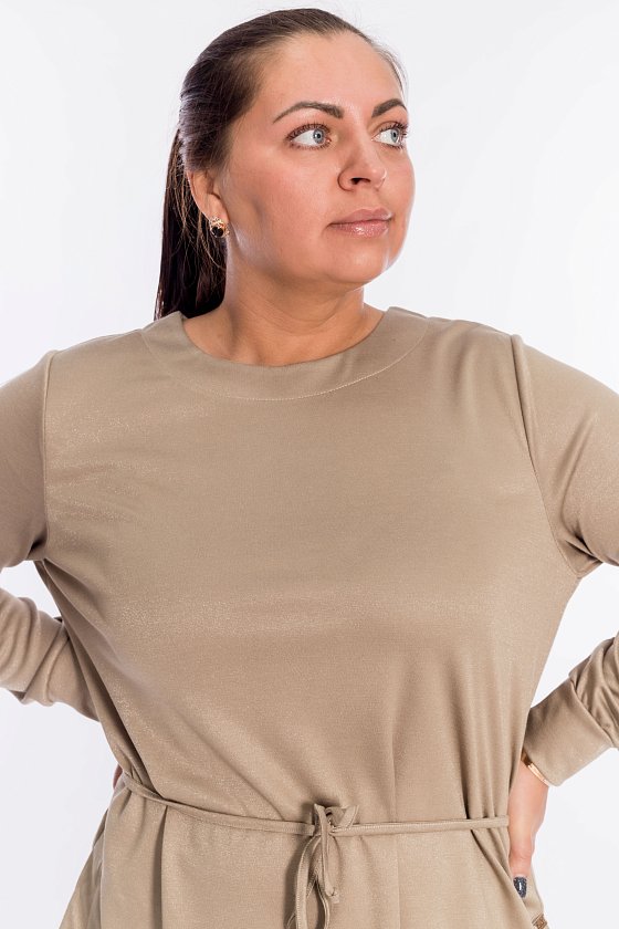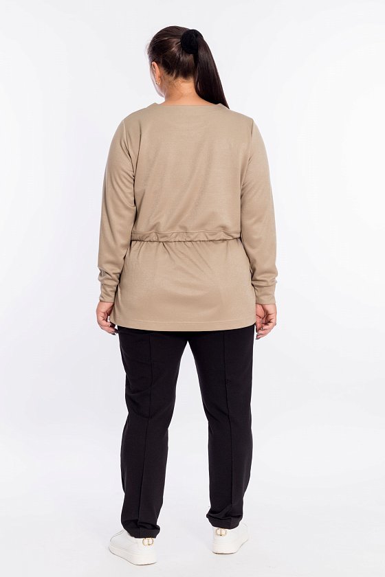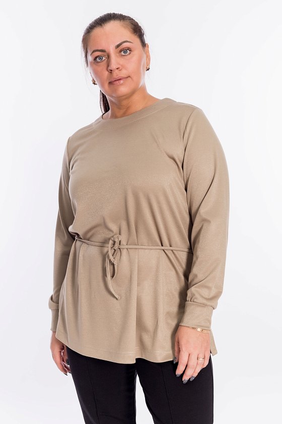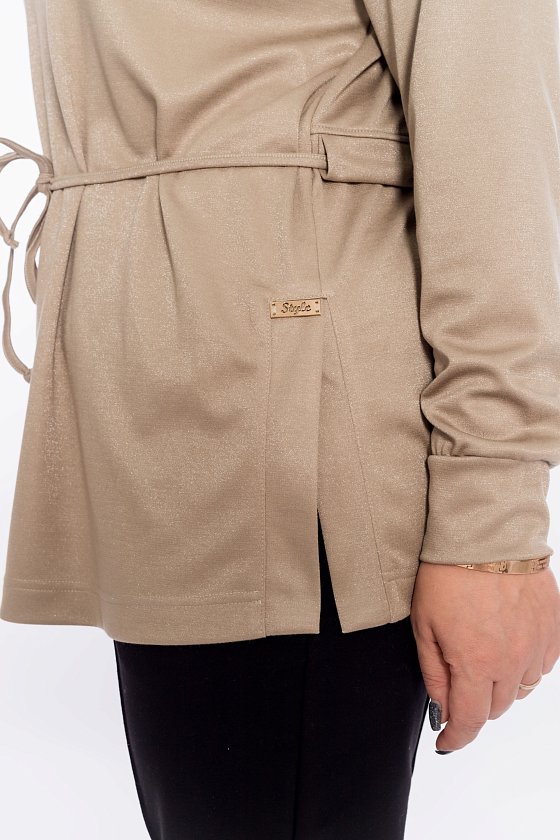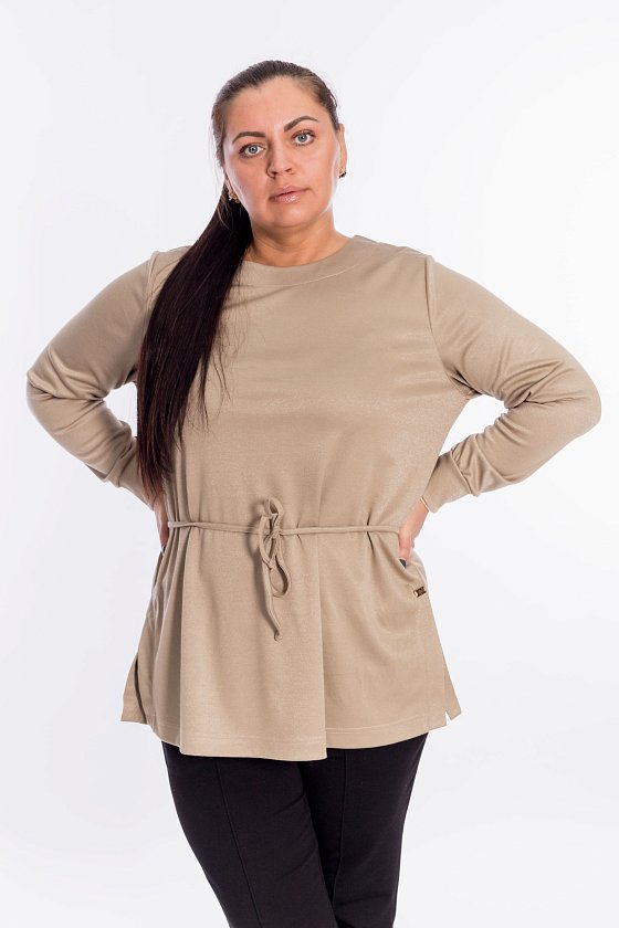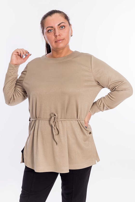 Джемпер выполнен из полотна "академик" с люрексом. С длинным втачным рукавом. Сзади по талии кулиска для шнура. По бокам разрезы с втачными планками.