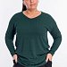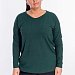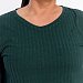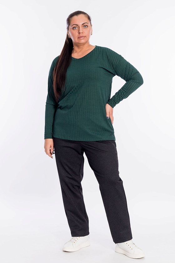 Джемпер выполнен из рибаны в крупный рубчик. Рукав длинный, со спущенной проймой. Вырез мягкий, V-образный. Спинка длиннее переда, по бокам небольшие разрезы.