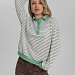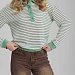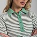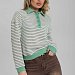 Джемпер-поло из жаккарда пенье крученого в полоску с отделочными деталями из однотонной рибаны: притачной пояс, манжеты, воротники и планки. Джемпер объемный со спущенной проймой.