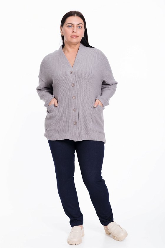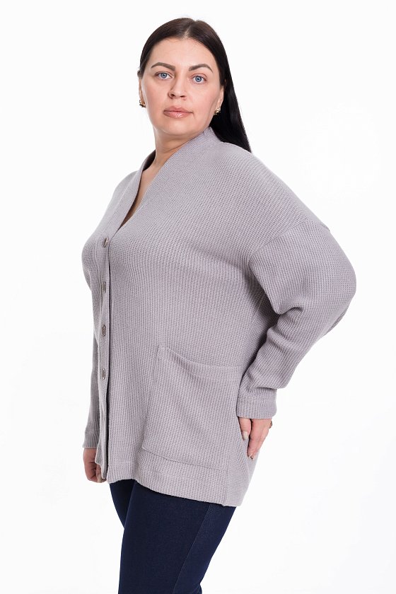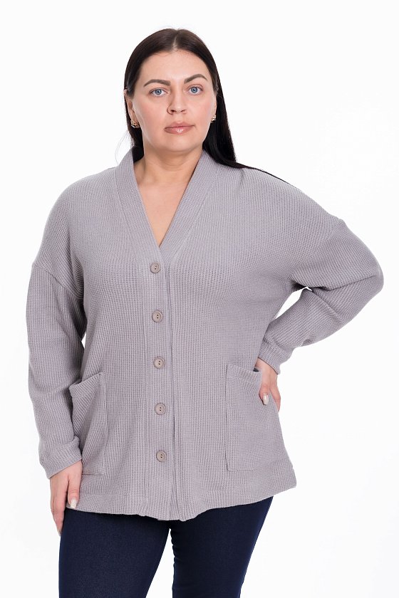 Женский кардиган из вязанного полотна в сером цвете и свободного кроя - отличный выбор для стильного и уютного образа. Со спущенной линией плеча и длинным рукавом, он создаст модный и современный вид. Застежка на пуговицы и V-образный вырез горловины придают изделию женственность. Накладные карманы спереди обеспечат удобство и практичность, позволяя хранить мелочи. Серый цвет кардигана легко сочетается с различной одеждой и аксессуарами, делая его универсальным вариантом для повседневного ношения.
