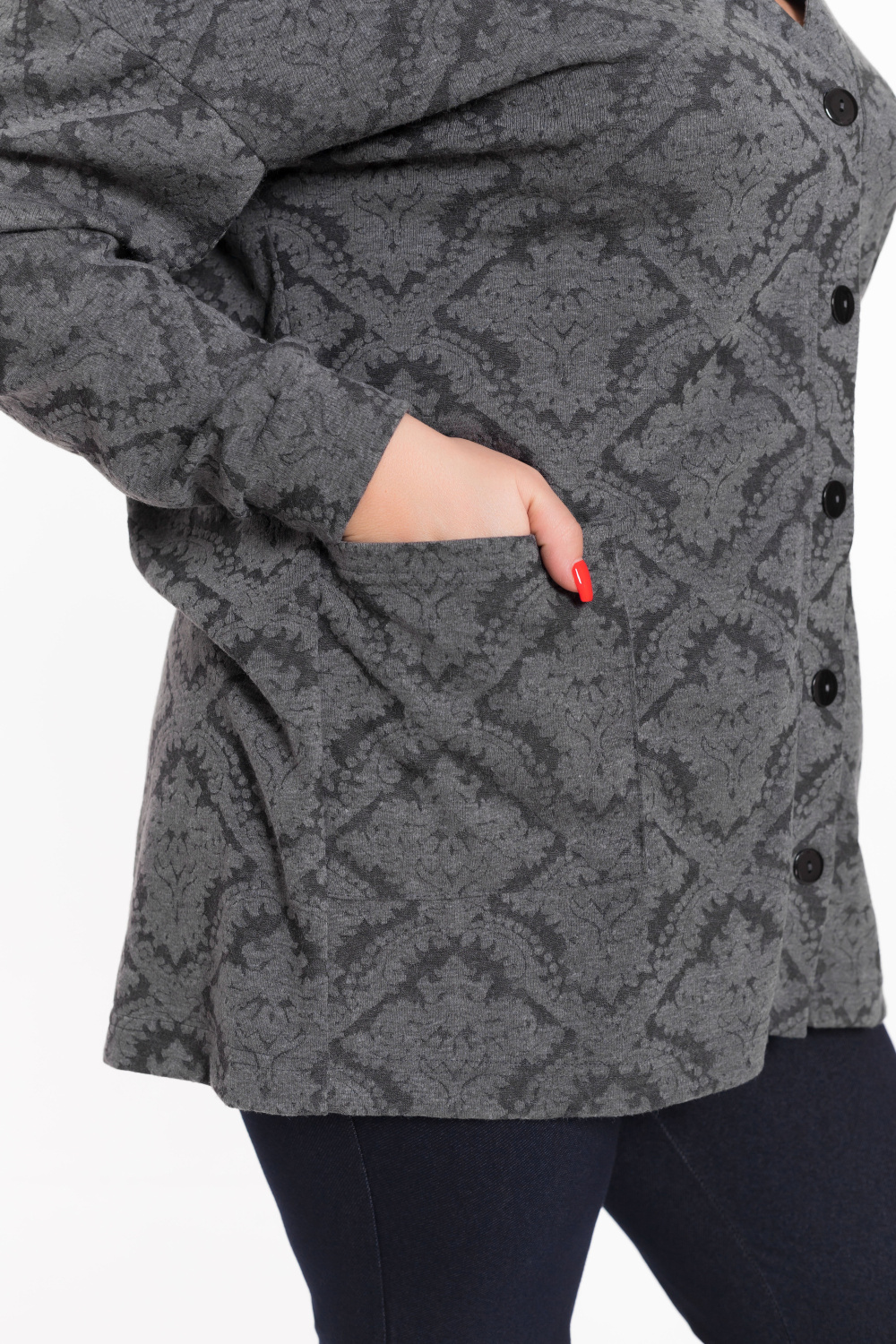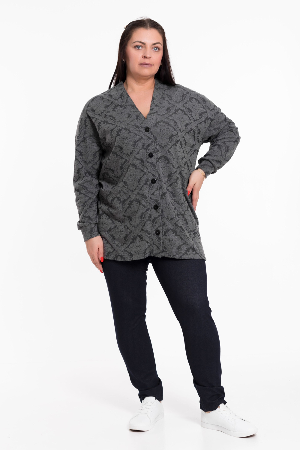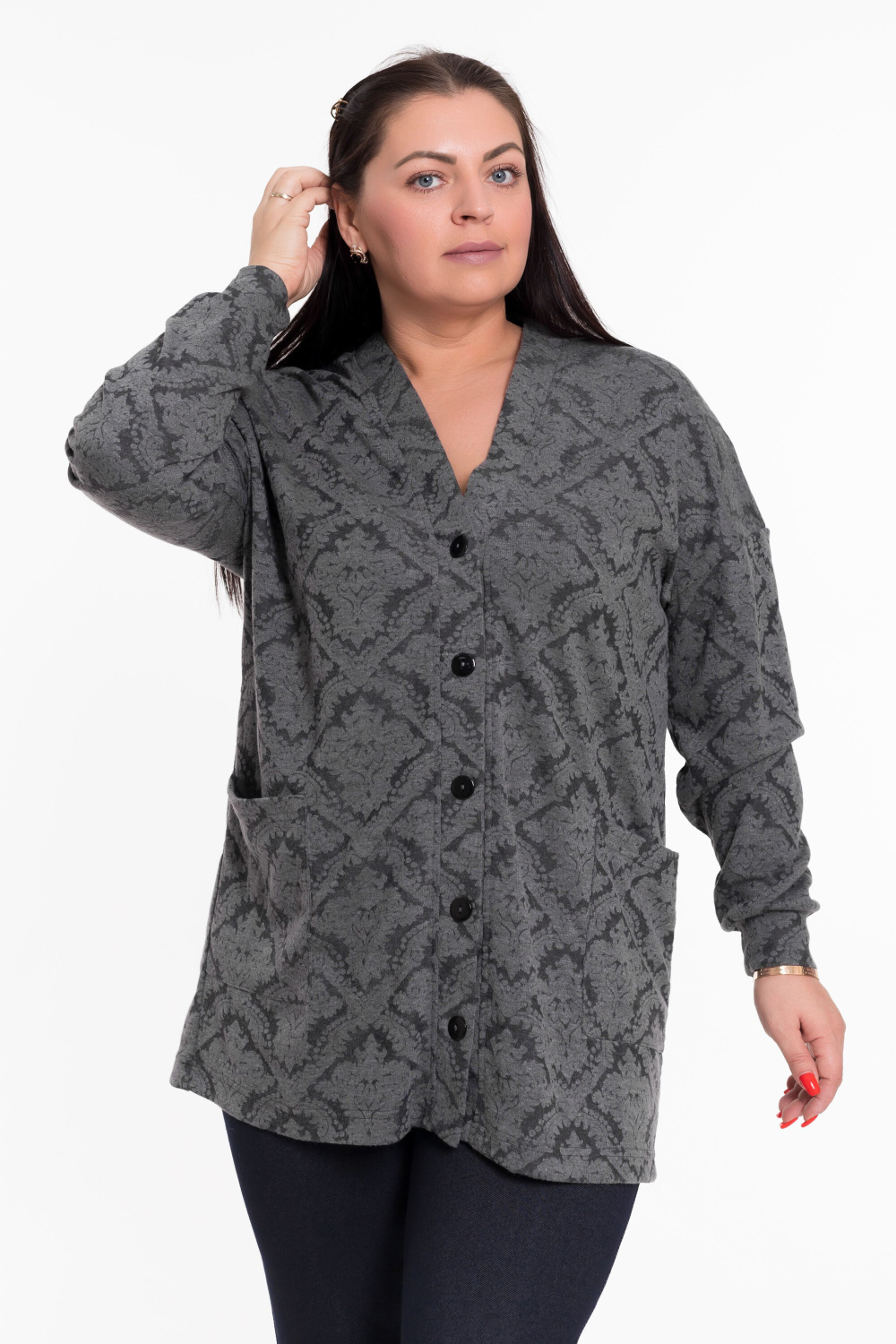 Женский кардиган — отличный выбор для создания элегантного и уютного образа. Он выполнен из мягкой ангорки с красивым набивным рисунком, что придаёт изделию изысканность и оригинальность.