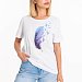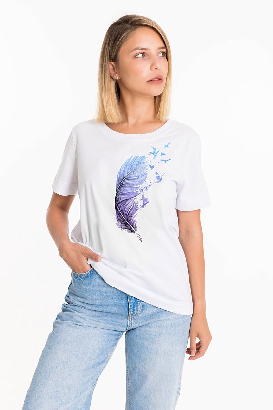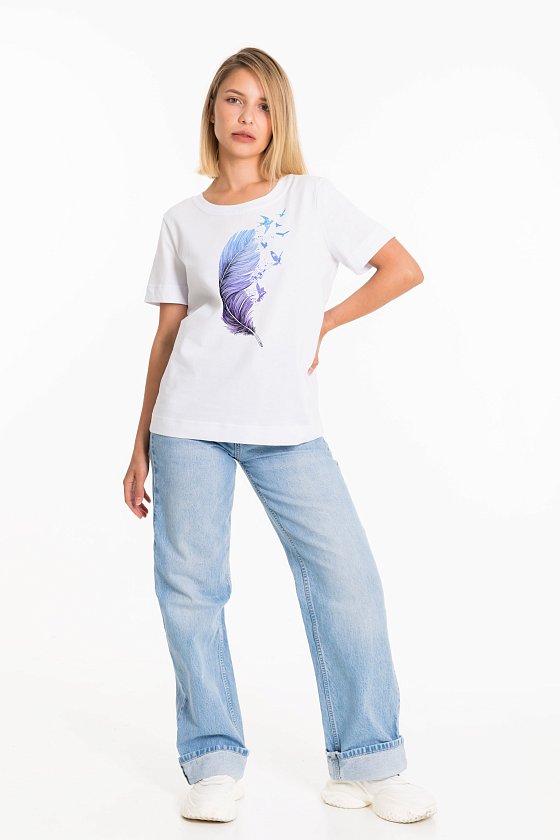 Женская футболка с принтом спереди изготовлена из хлопкового полотна. Футболка с коротким втачным рукавом и круглым вырезом горловины, что придает ей классический стильный вид. Такая модель футболки отлично сочетается с джинсами, брюками или юбкой. Изготовленная из натуральной ткани, футболка обеспечит комфорт в течение всего дня.
