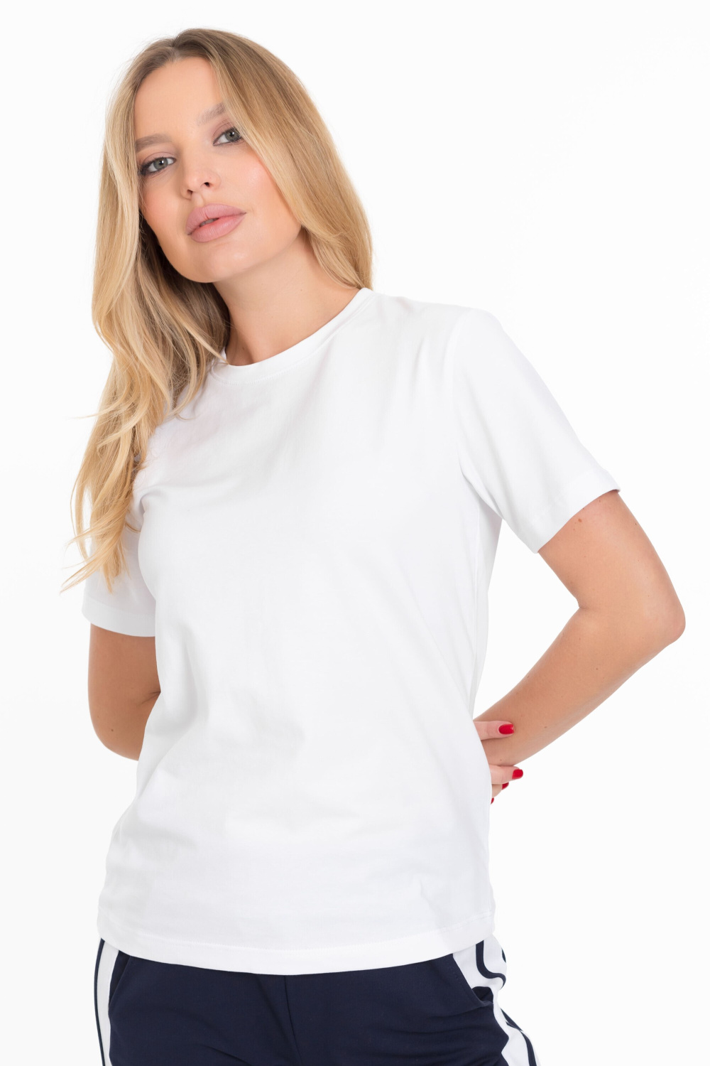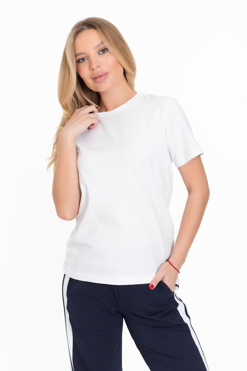 Женская футболка изготовлена из хлопкового полотна с добавлением лайкры, что обеспечивает комфорт и хорошую воздухопроницаемость. Футболка имеет короткий втачной рукав и круглый вырез горловины, что придает ей классический стильный вид. Такая модель базового белого цвета отлично сочетается с джинсами, брюками или юбкой. Изготовленная из натуральной ткани, футболка обеспечит комфорт в течение всего дня.