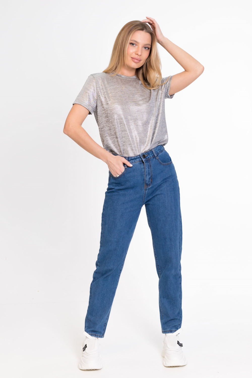 Короткий втачной рукав, круглый вырез горловины, свободный крой. Универсальна с любым низом.