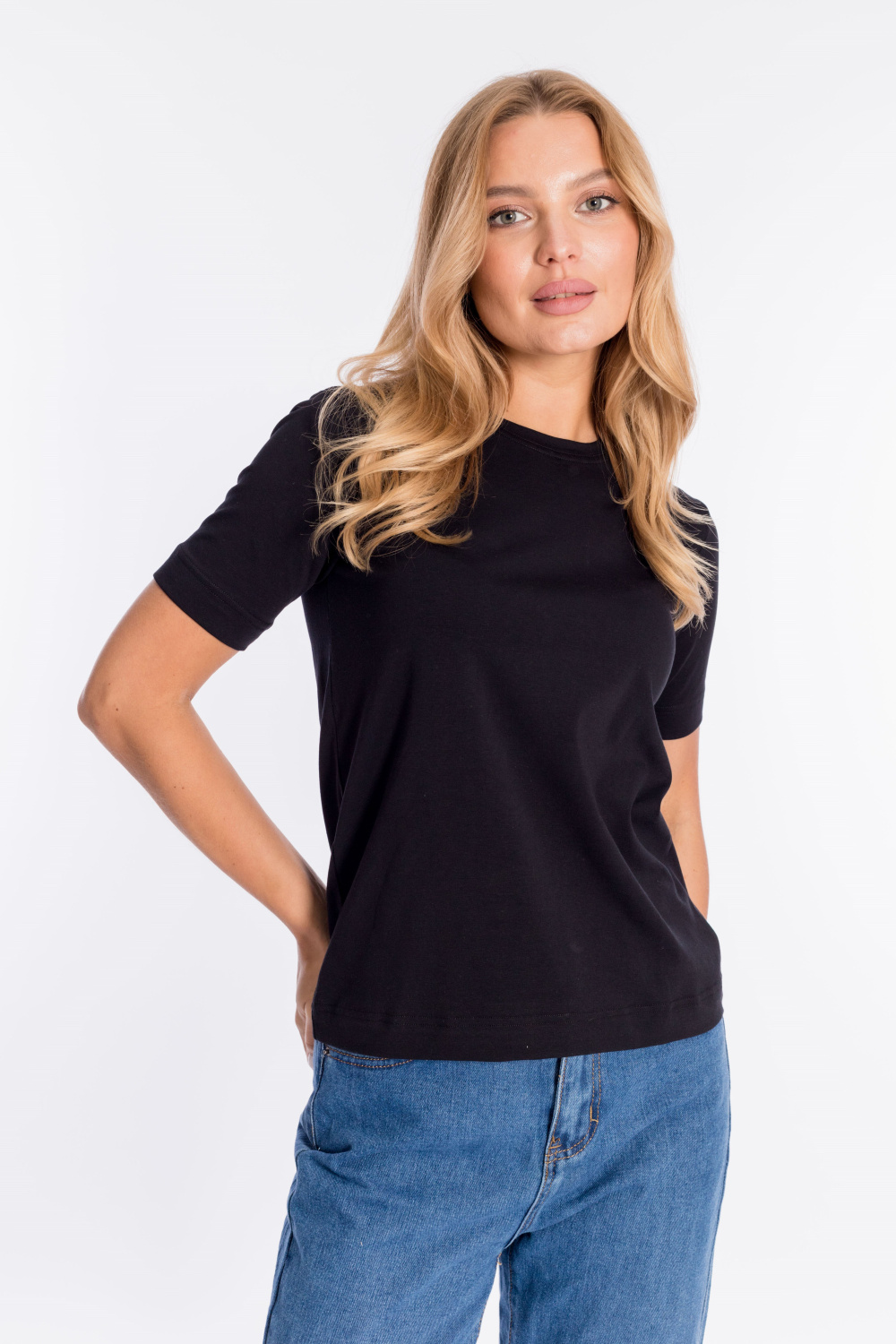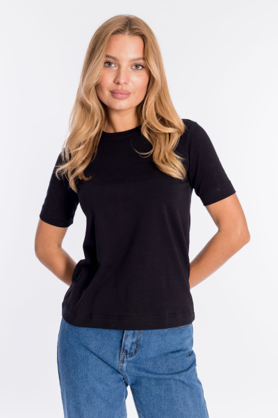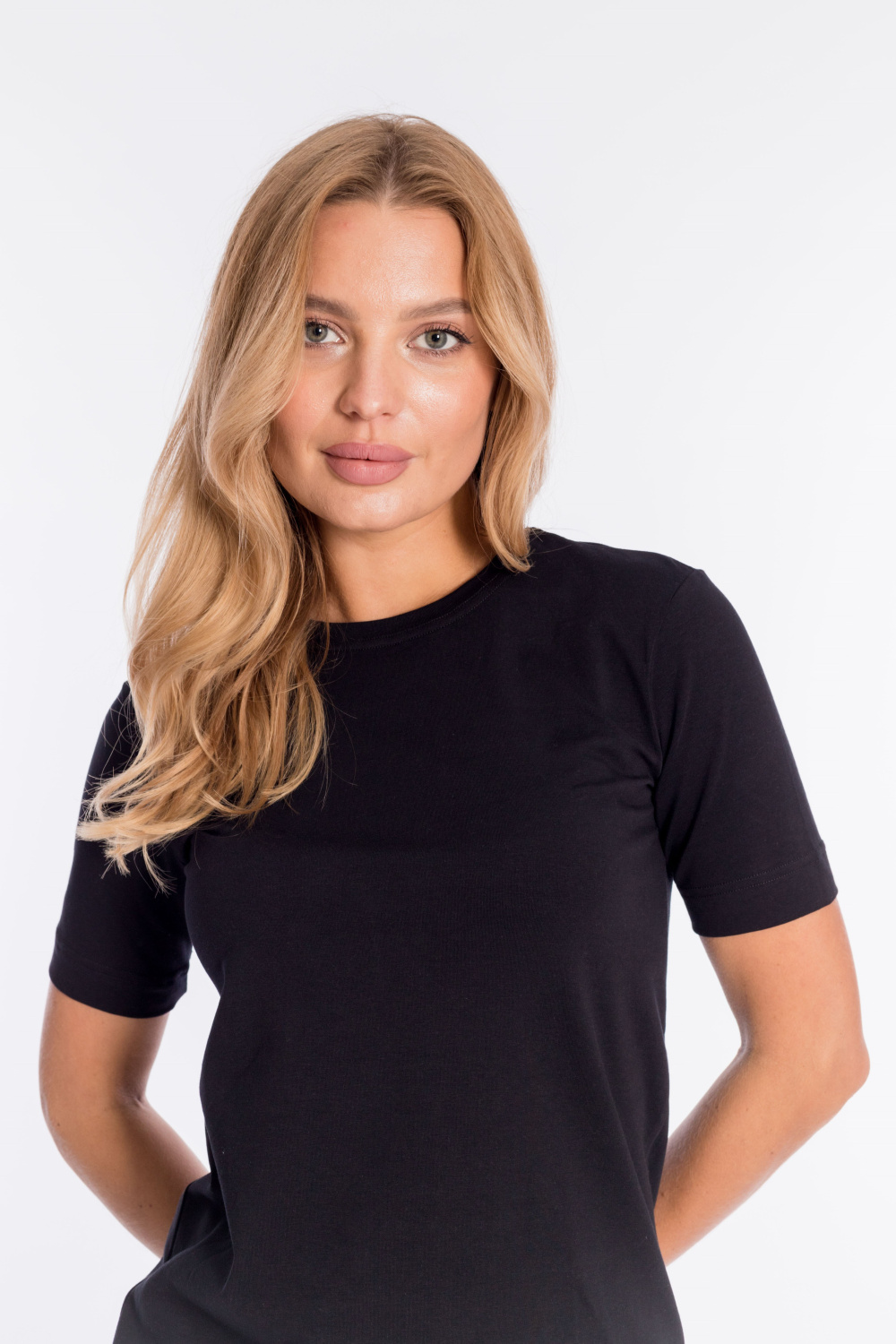Женская футболка выполнена из однотонной кулирки с лайкрой. С коротким рукавом и круглым вырезом горловины, оформленным планкой.