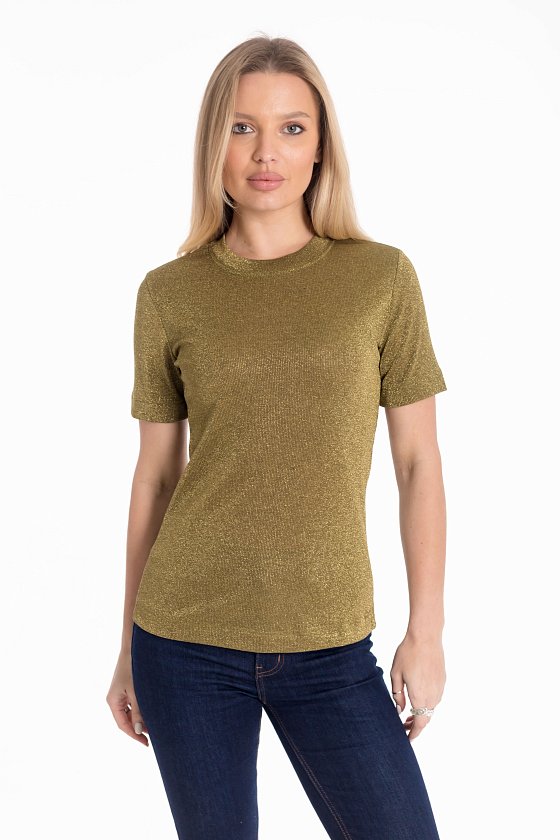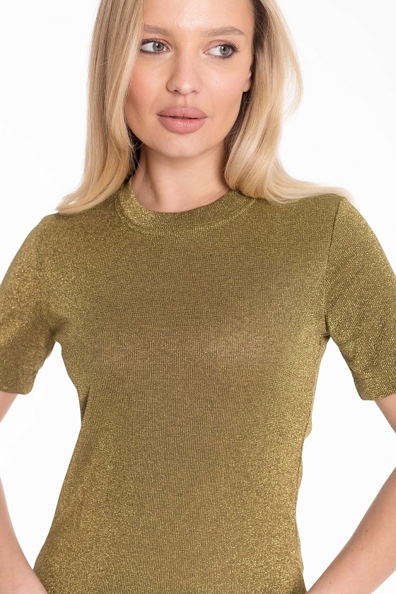 Футболка женская, облегающего силуэта, выполнена из кашкорсе с люрексом. Горловина с круглым вырезом, рукав короткий.