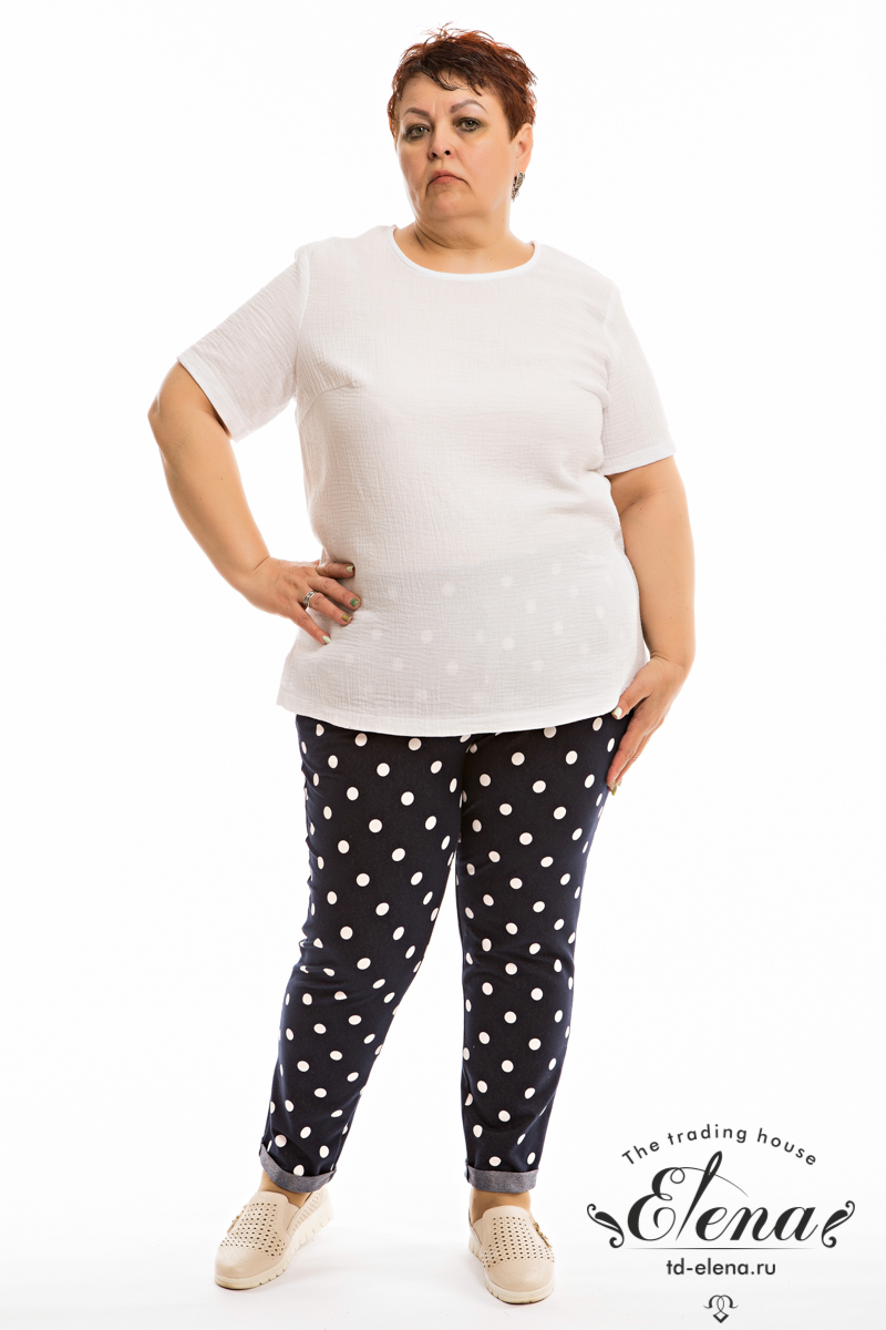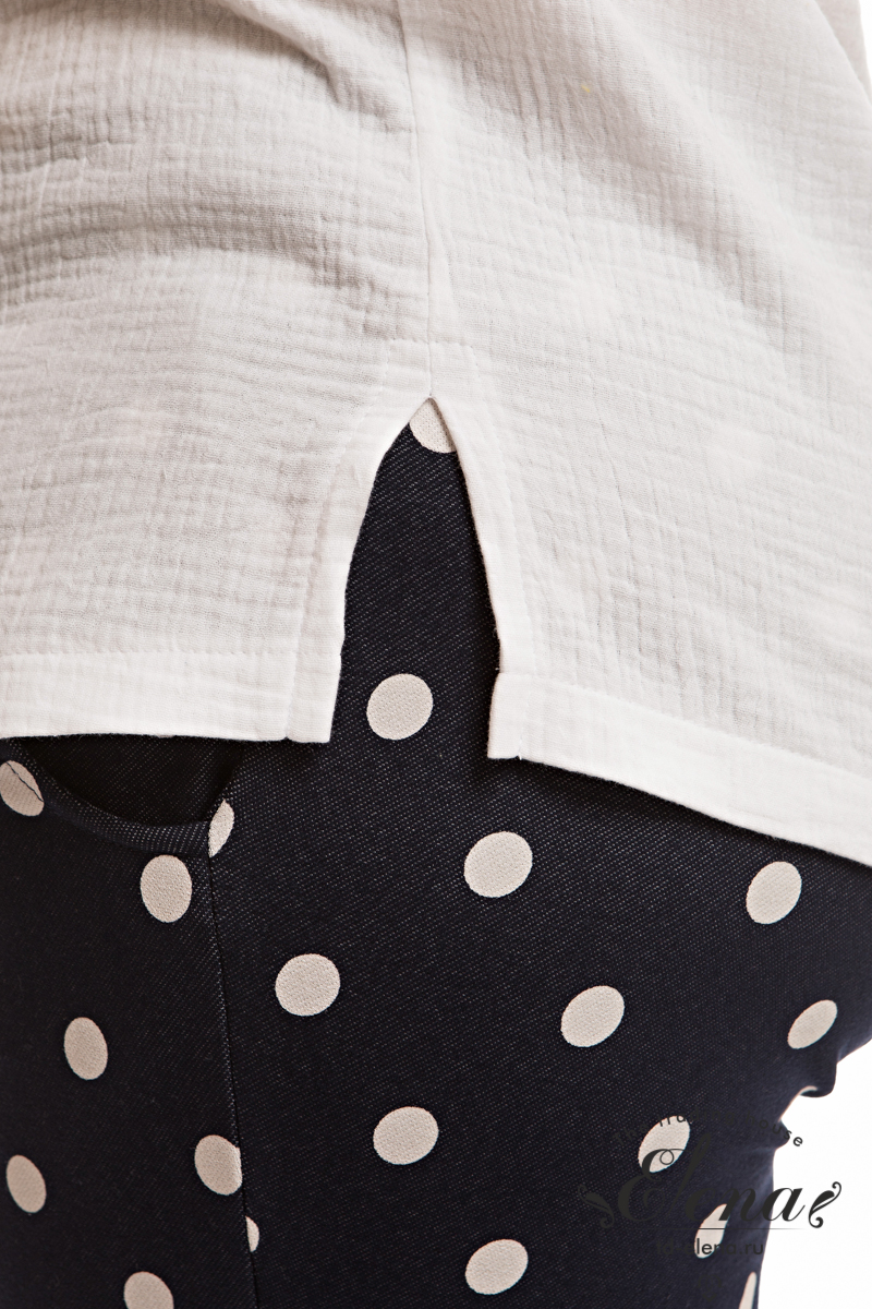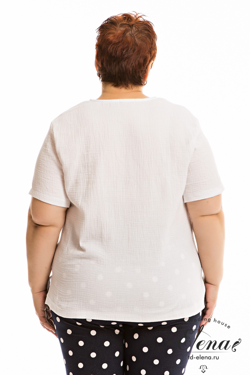 Футболка выполнена из хлопкового полотна - муслина. С коротким втачным рукавом и овальным вырезом горловины. Внизу, в боковых швах небольшие разрезы.