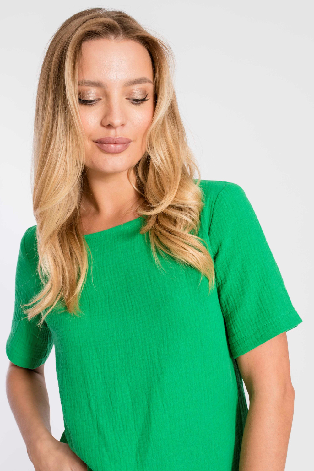 Футболка выполнена из хлопкового полотна - муслина. С коротким втачным рукавом и овальным вырезом горловины. Внизу, в боковых швах небольшие разрезы.