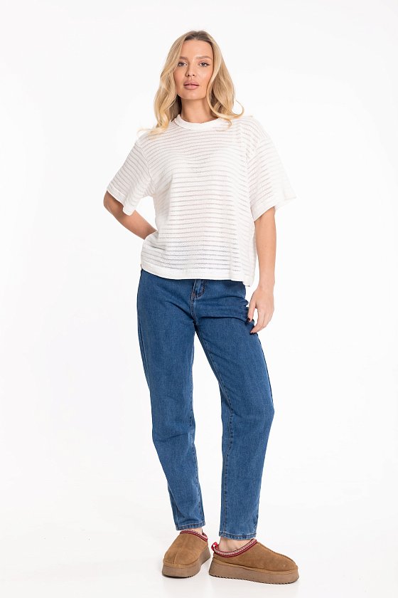 Футболка выполнена из лёгкого вязаного полотна, которое красиво ложится по фигуре и обеспечивает комфорт в носке. Свободный силуэт со спущенной линией плеча создаёт расслабленный и современный образ. Горловина аккуратно обработана бейкой, что придаёт модели завершённый вид. Отличный вариант для повседневных образов.