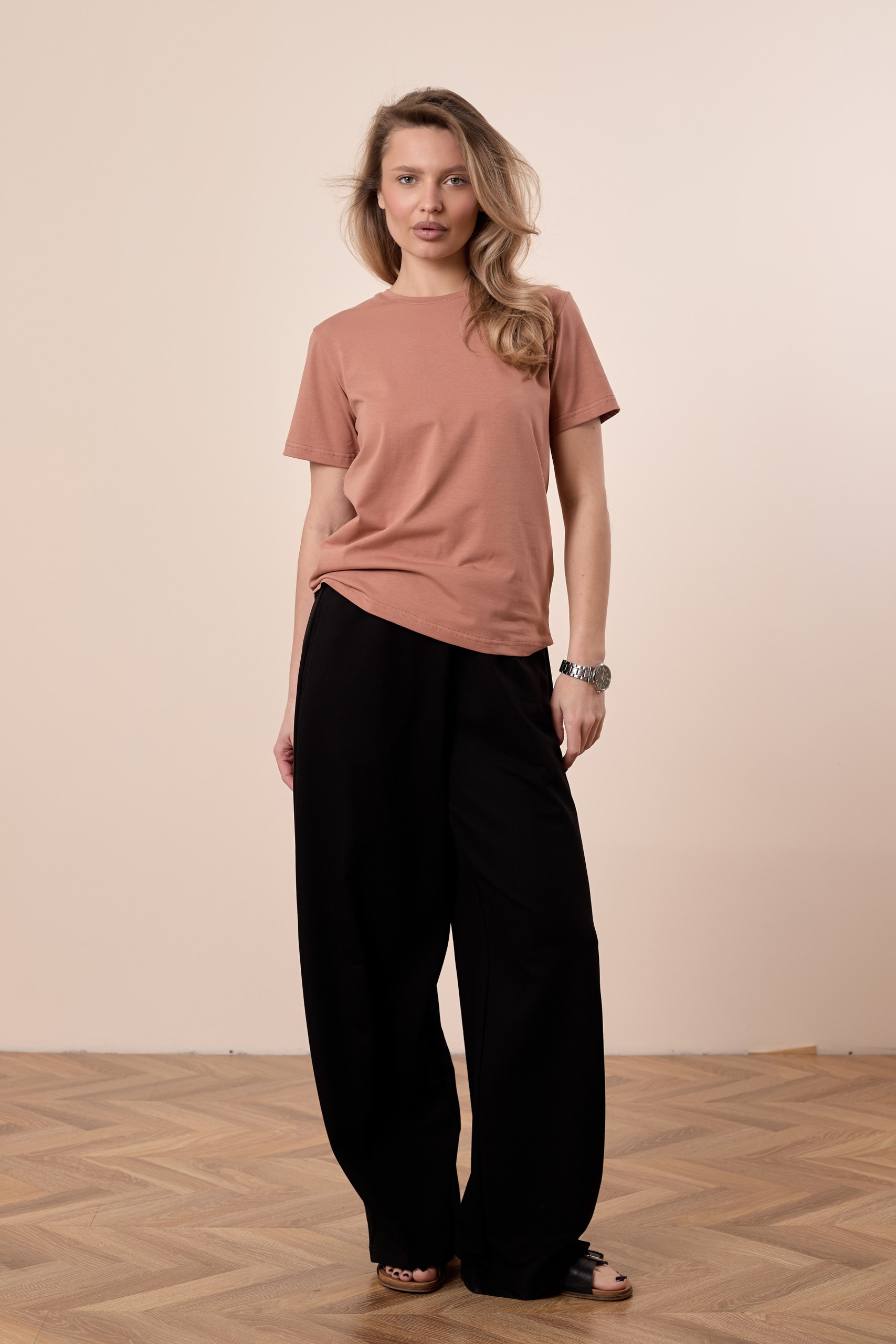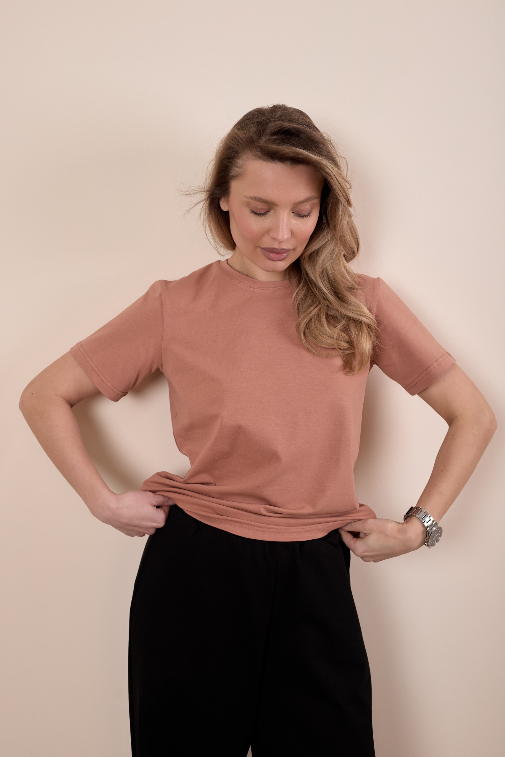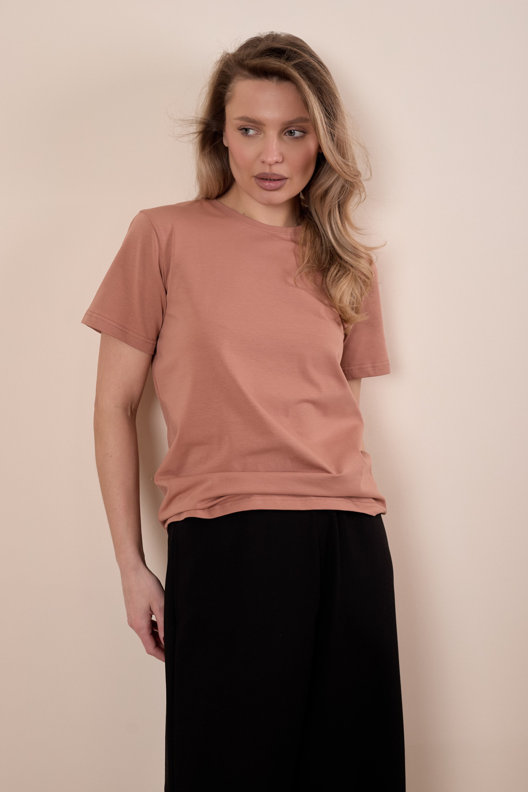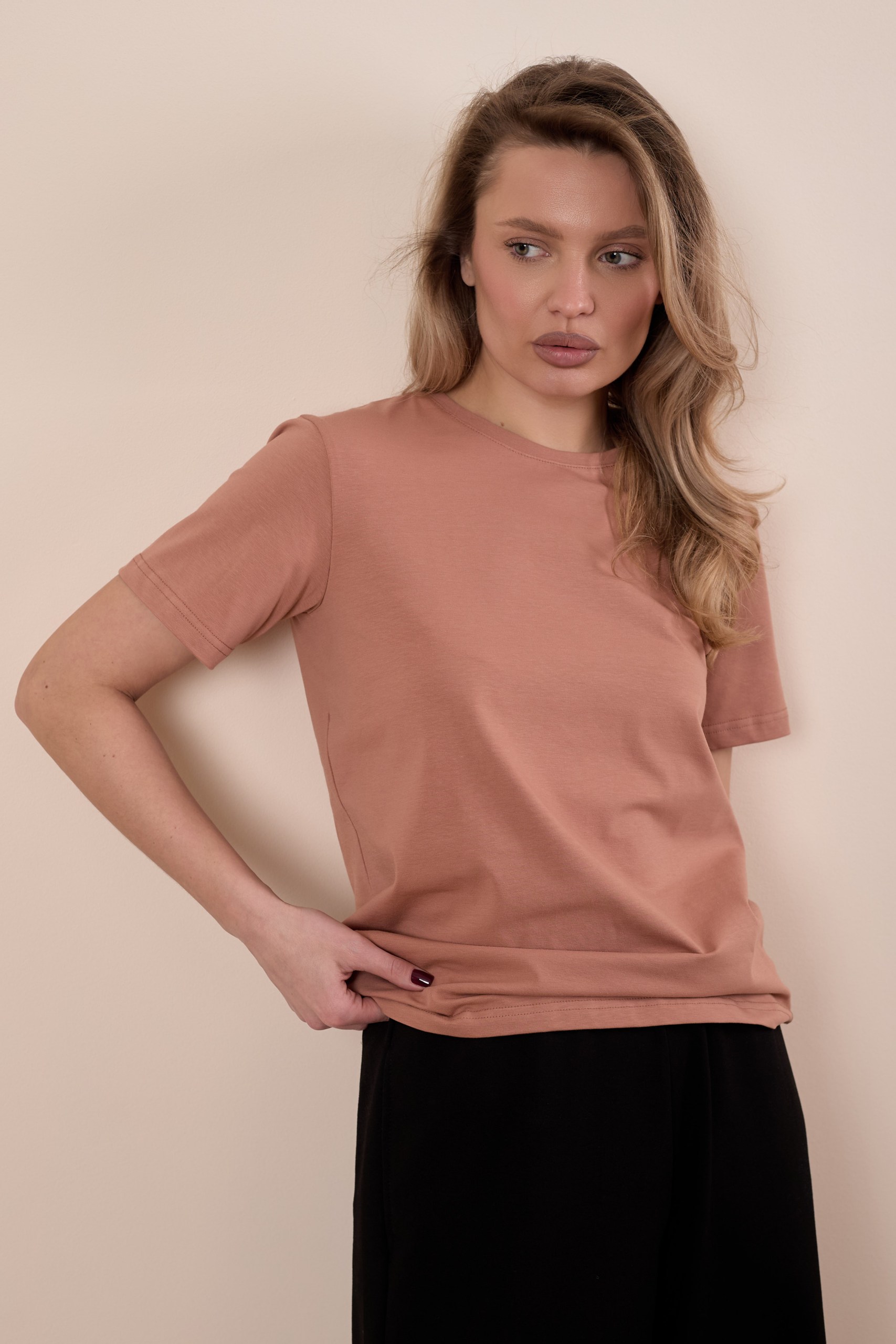 Женская футболка изготовлена из хлопкового полотна с добавлением лайкры, что обеспечивает комфорт и хорошую воздухопроницаемость. Футболка имеет короткий втачной рукав и круглый вырез горловины, что придает ей классический стильный вид. Такая модель светло-коричневого цвета отлично сочетается с джинсами, брюками или юбкой. Изготовленная из натуральной ткани, футболка обеспечит комфорт в течение всего дня.