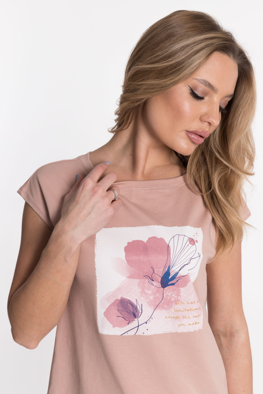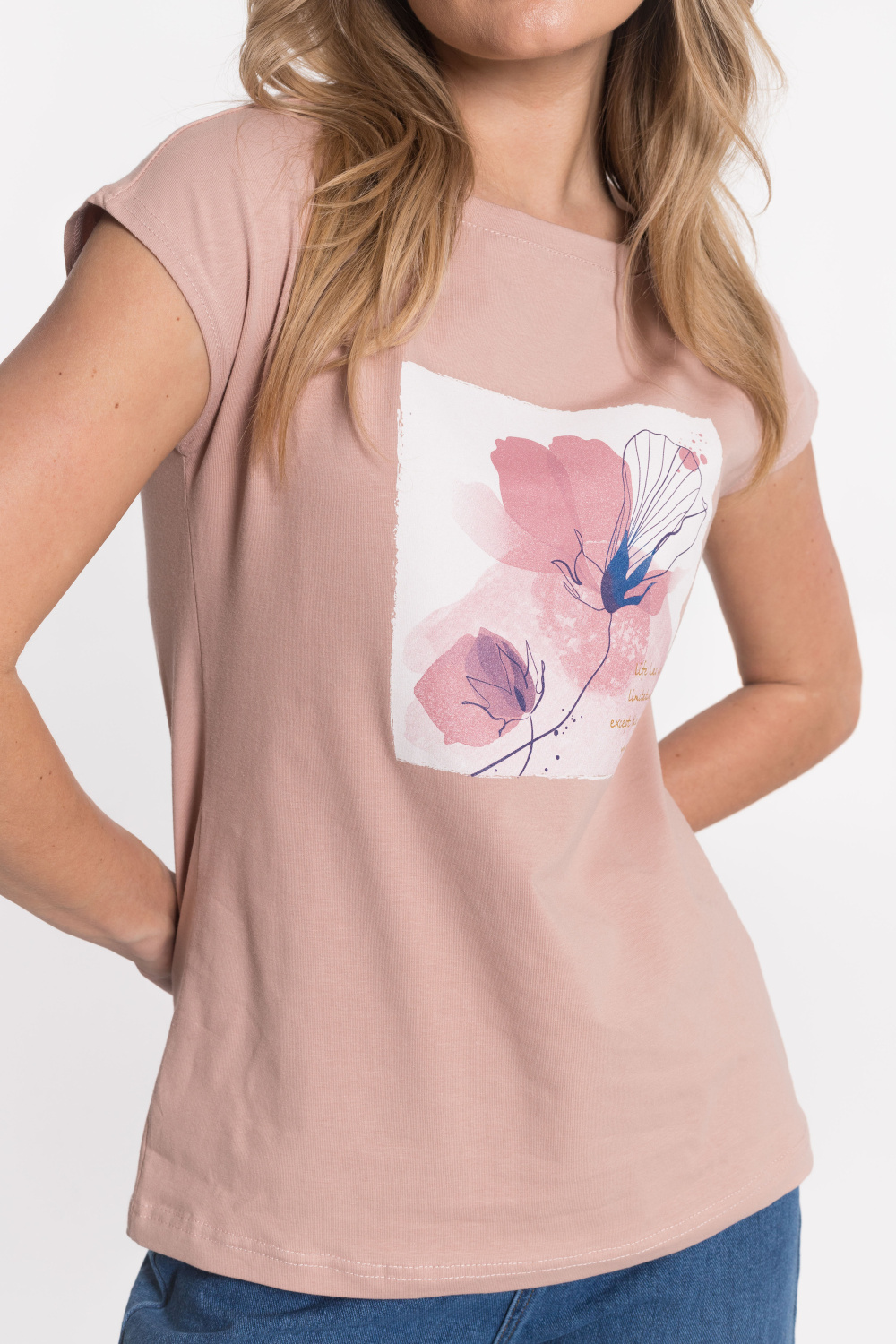 Вырез горловины лодочка, спущенный рукав. принт на полочке.