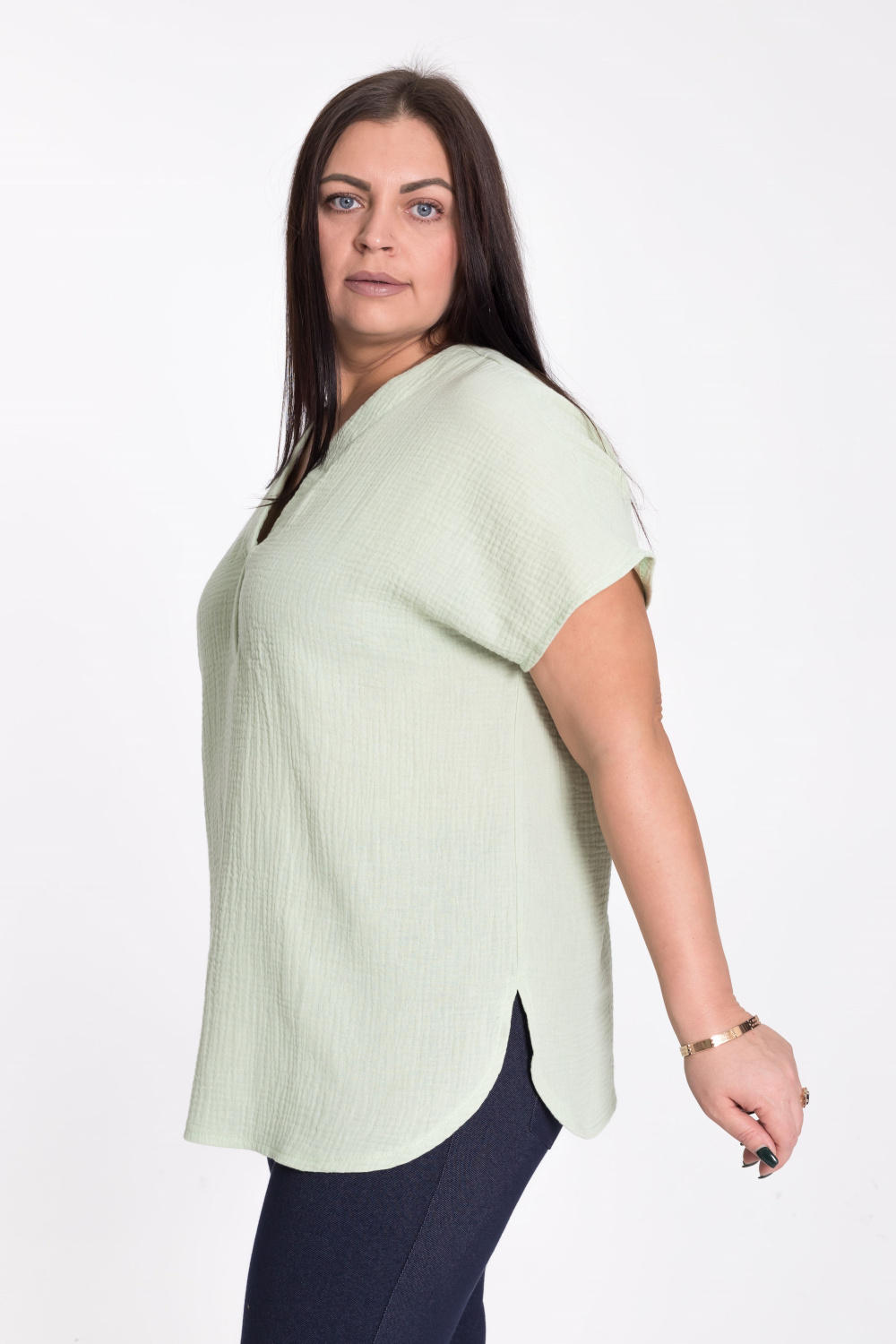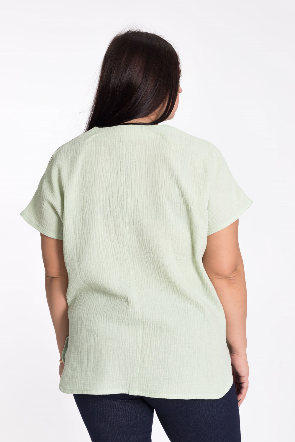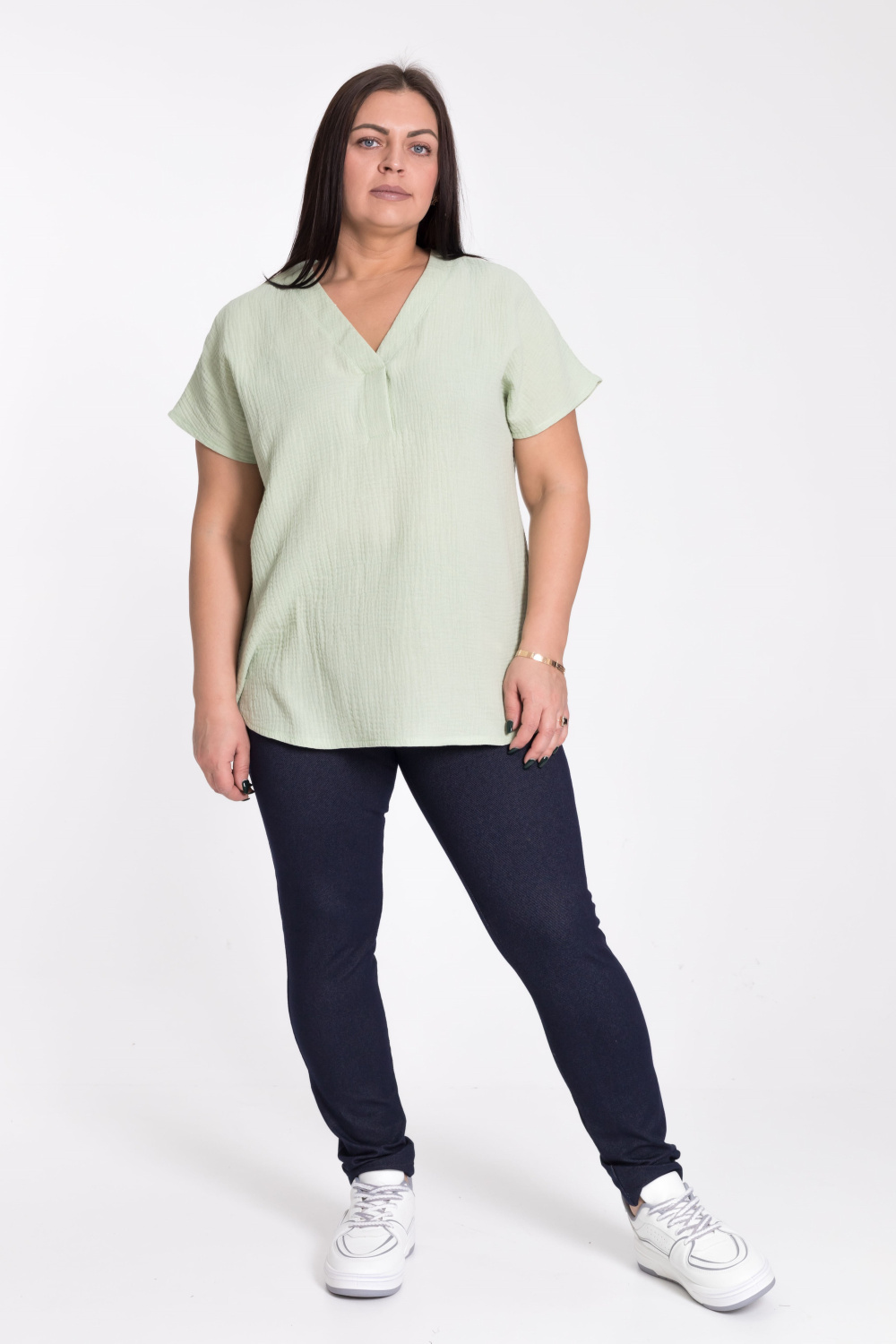 Женская футболка выполнена из мягкого и лёгкого муслина цвета полынь. Она имеет V-образный вырез горловины, что придаёт изделию элегантность и женственность. Футболка оснащена цельнокроеным коротким рукавом, который обеспечивает свободу движений. Боковые срезы линии низа закруглены, что добавляет изделию мягкость и комфорт. Однотонный цвет футболки позволяет сочетать её с различными элементами гардероба. Эта футболка станет отличным выбором для повседневной носки, обеспечивая удобство и стиль.