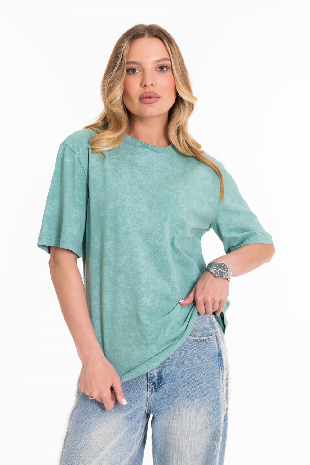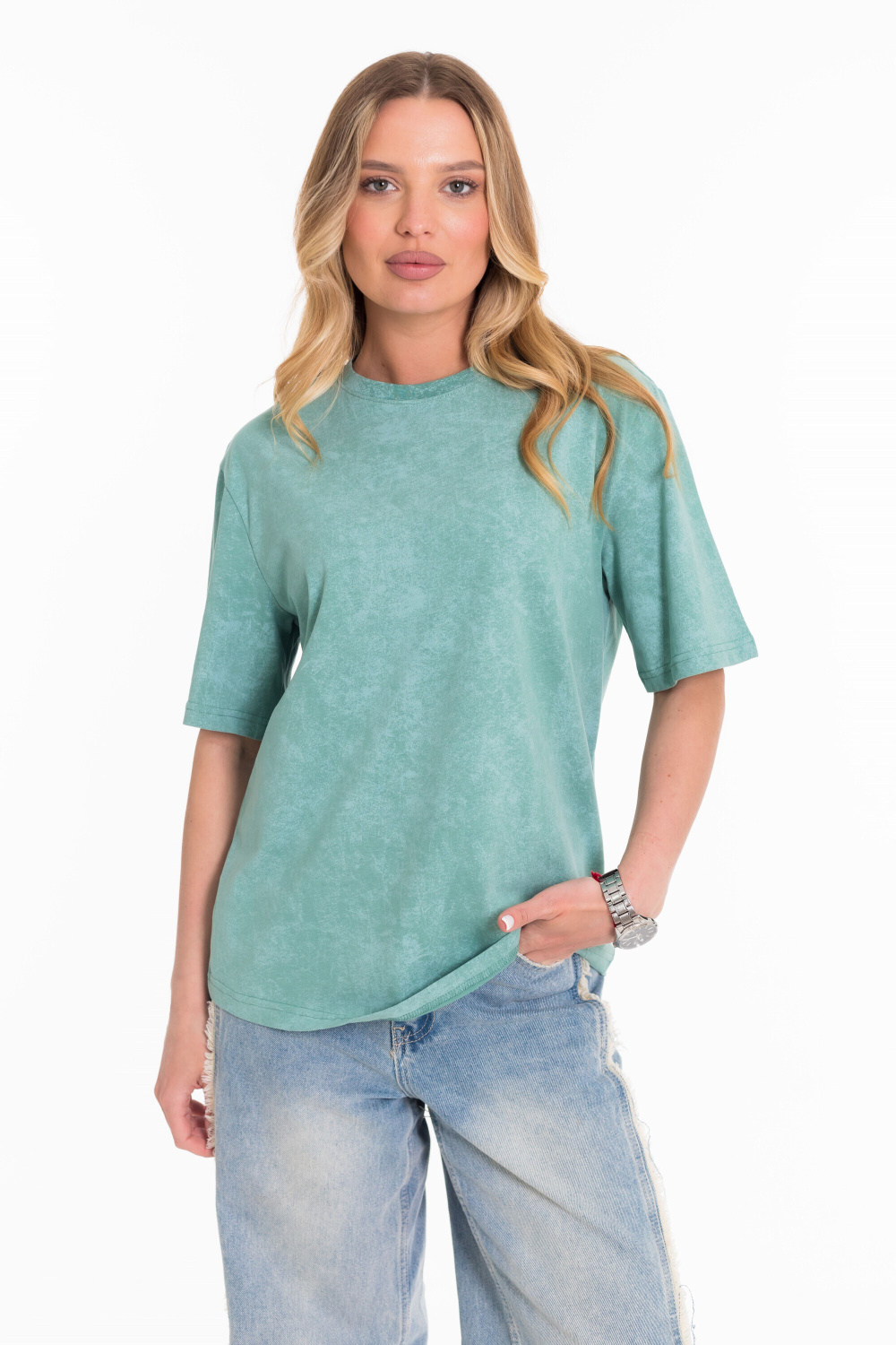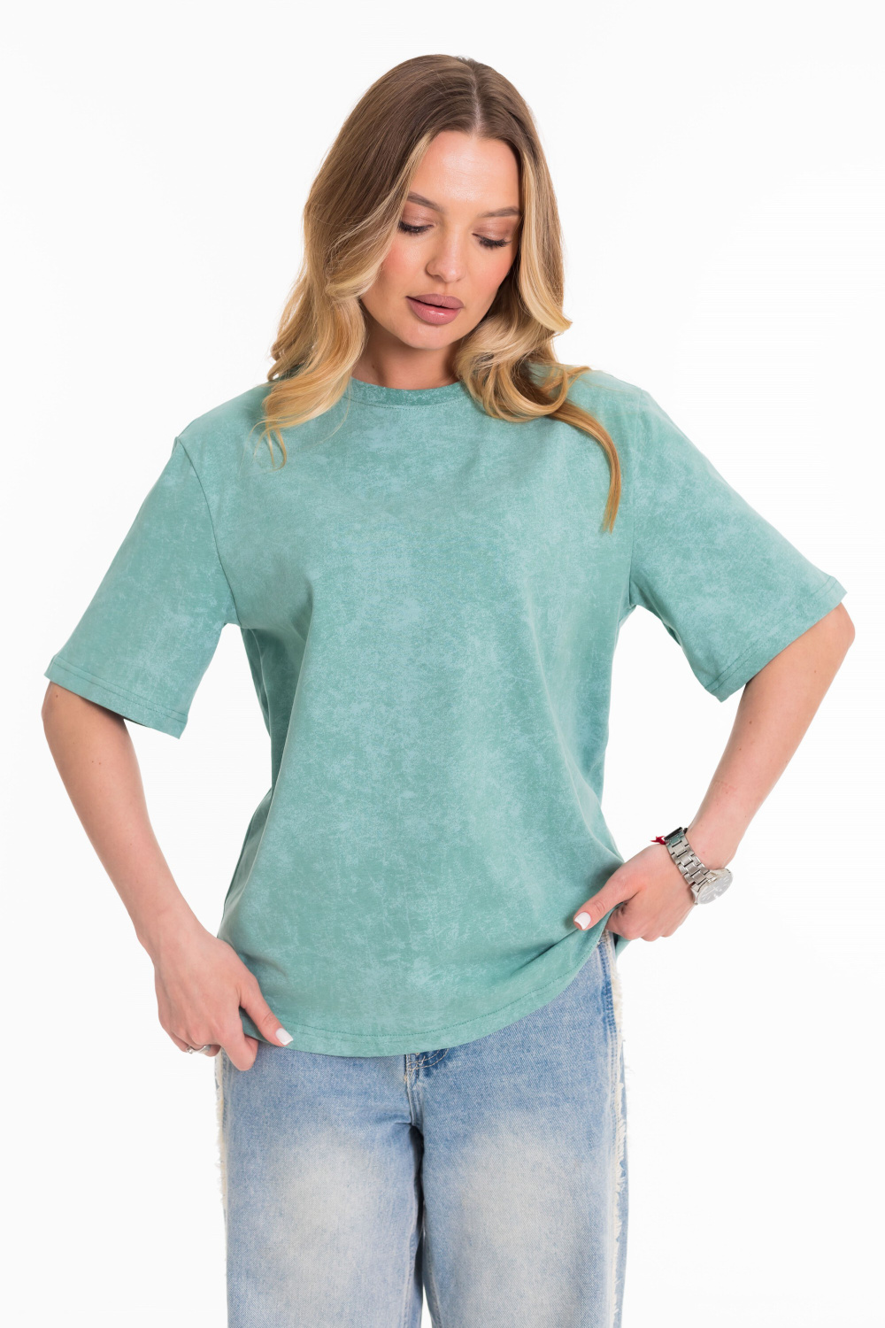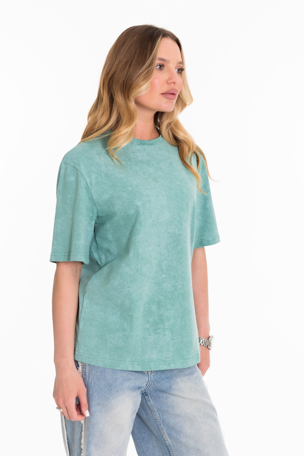 Женская футболка из лёгкой и приятной к телу ткани — отличный выбор для повседневного гардероба. Изготовлена из кулирки цвета "ментол", имеет свободный силуэт и круглый вырез горловины. Футболка идеально подойдёт для отдыха или домашней носки.