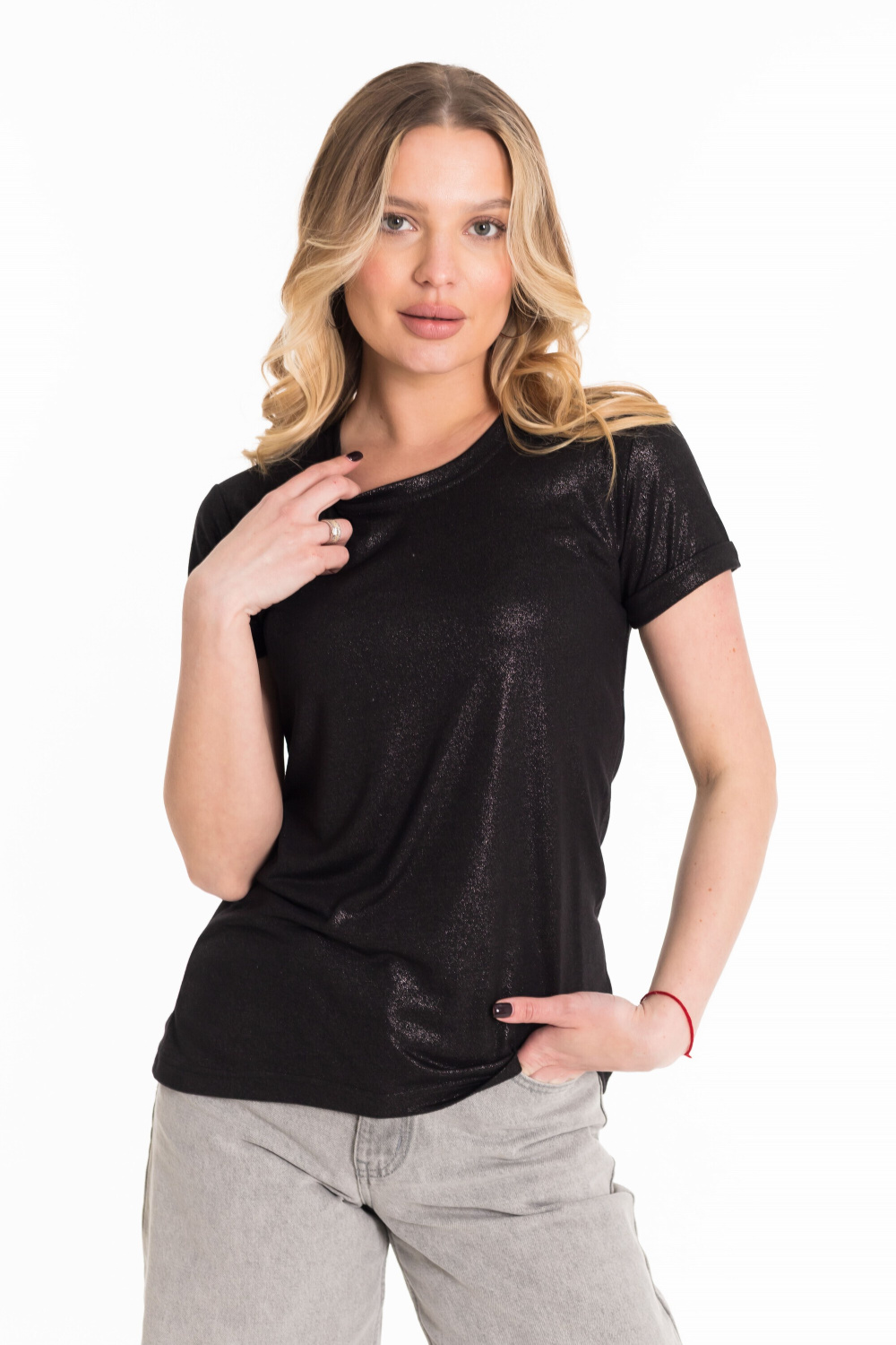 Футболка выполнена из однотонного полотна вискоза с напылением. Силуэт футболки облегающий, короткий рукав с отворотом, горловина имеет круглый вырез.