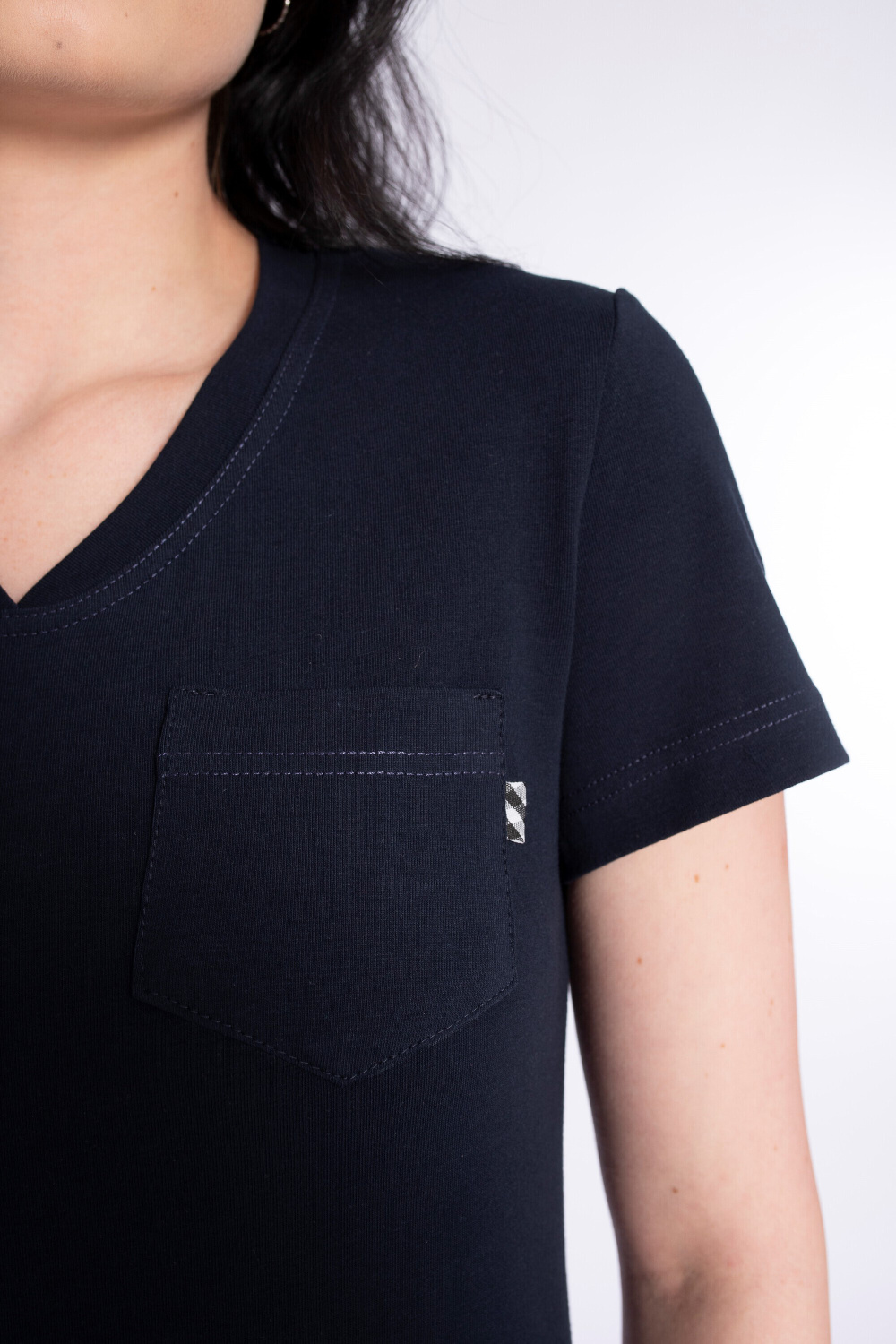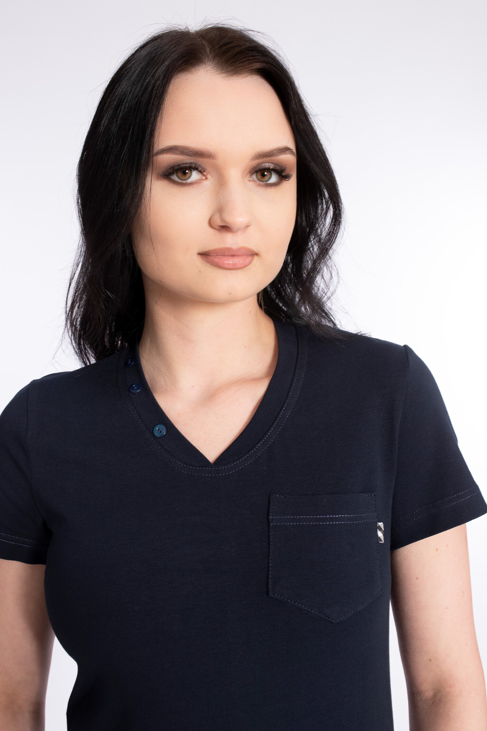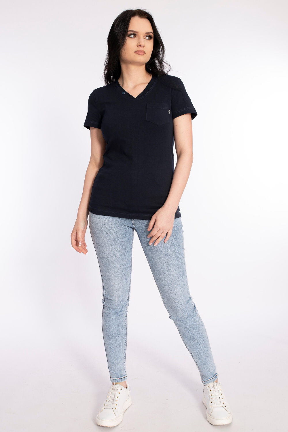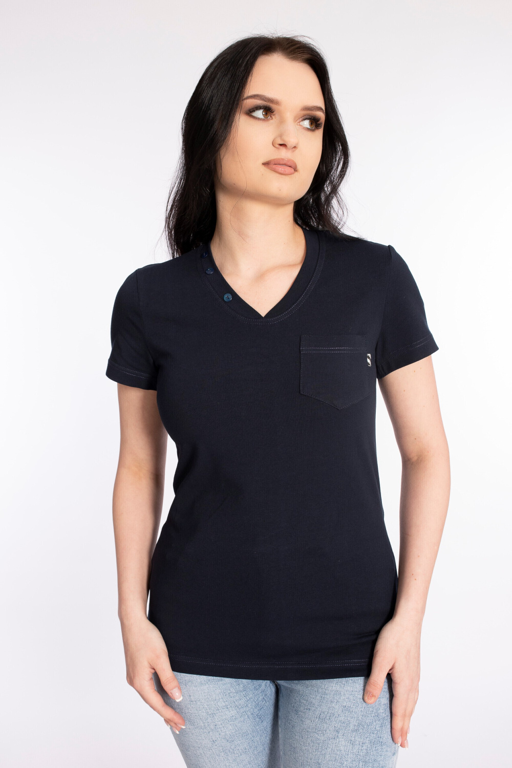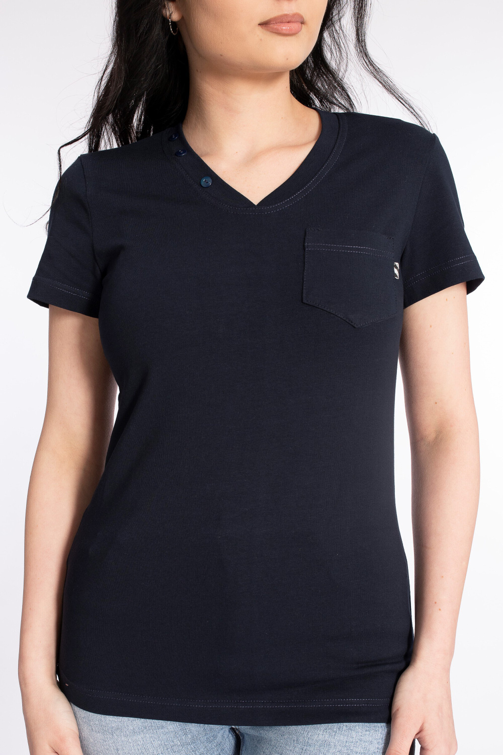 Футболка выполнена из полотна кулирка с лайкрой. Силуэт приталенный, короткий рукав. Слева настрочен небольшой карман с декоративным флажком. На планке V-образного выреза горловины пришиты пуговицы.