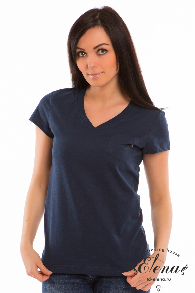 Футболка женская выполнена из полотна кулирка фламли. Силуэт полуприлегающий, вырез горловины V-образный, рукав короткий. Слева настрочен карман с декоративным флажком.