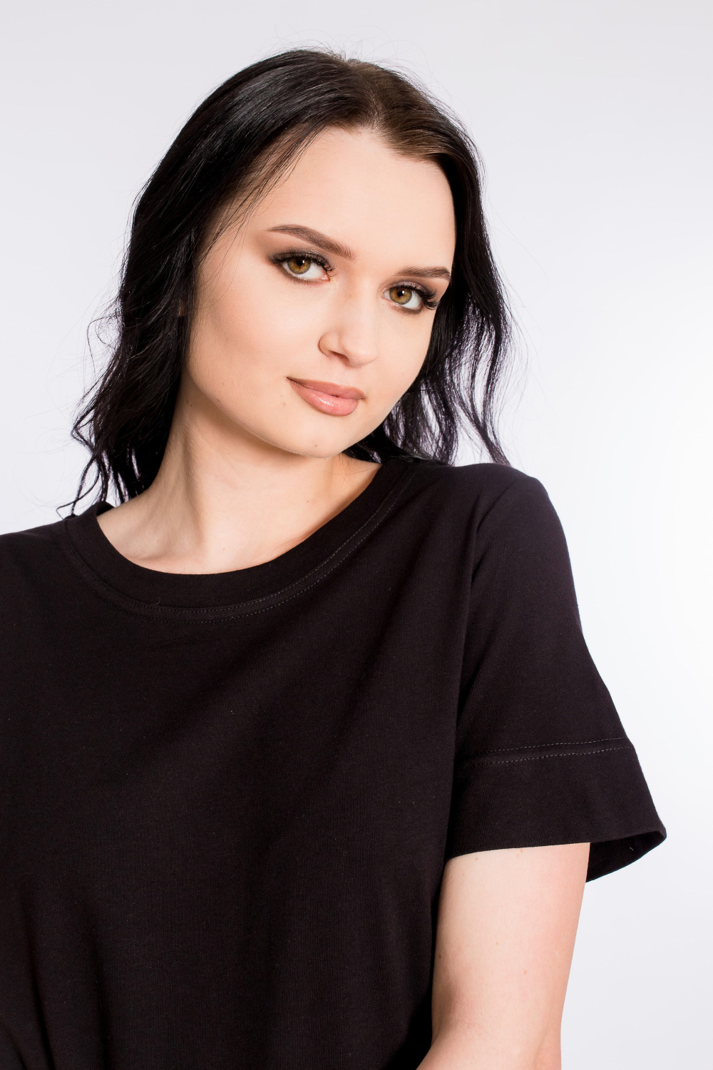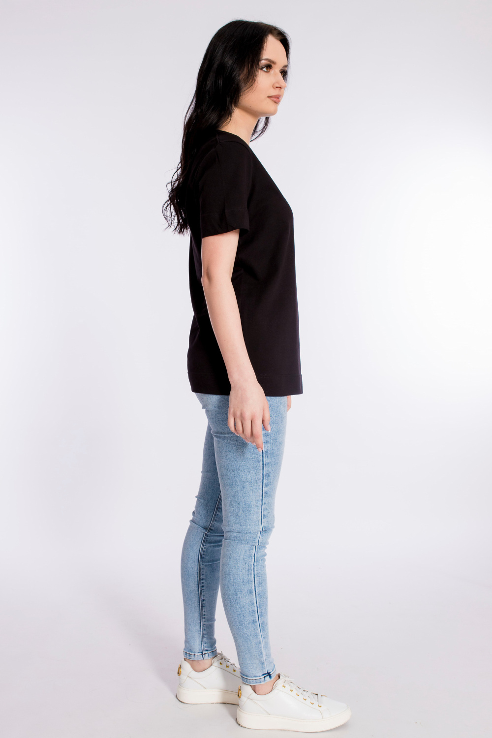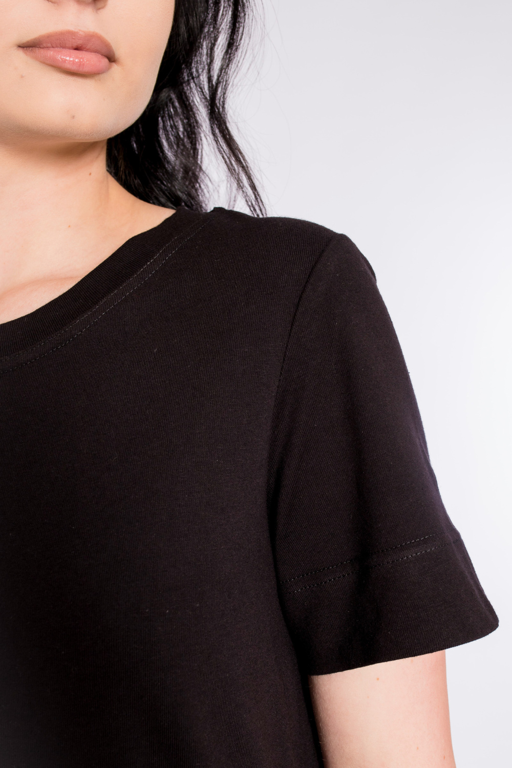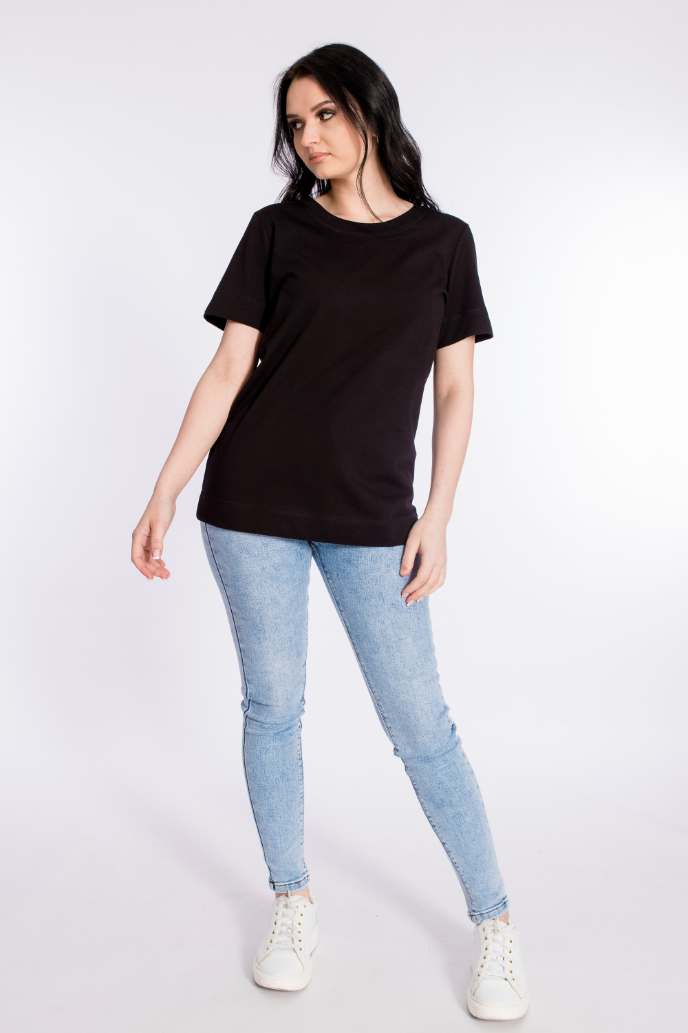 Футболка из однотонной кулирки, 100% хлопок. С коротким втачным рукавом и притачной планкой по горловине.