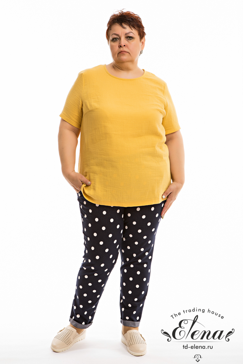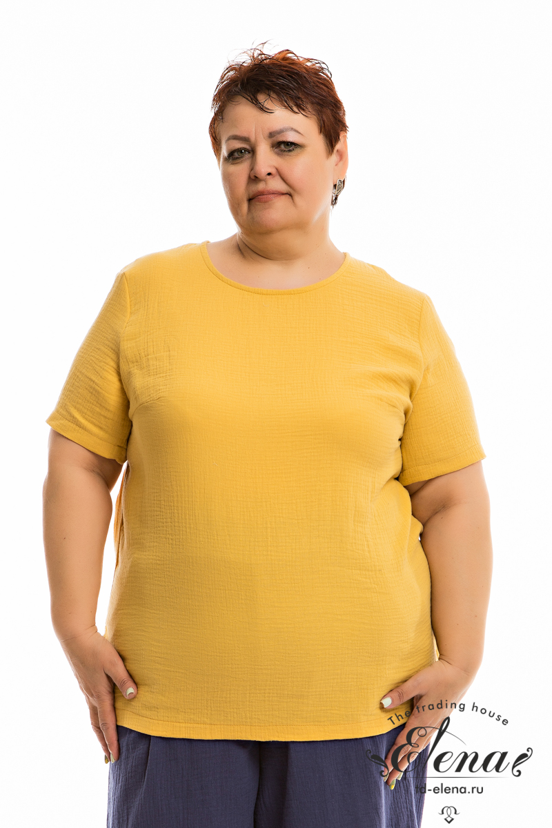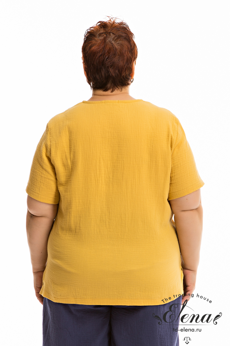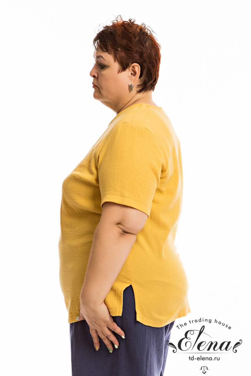 Футболка выполнена из хлопкового полотна - муслина. С коротким втачным рукавом и овальным вырезом горловины. Внизу, в боковых швах небольшие разрезы.