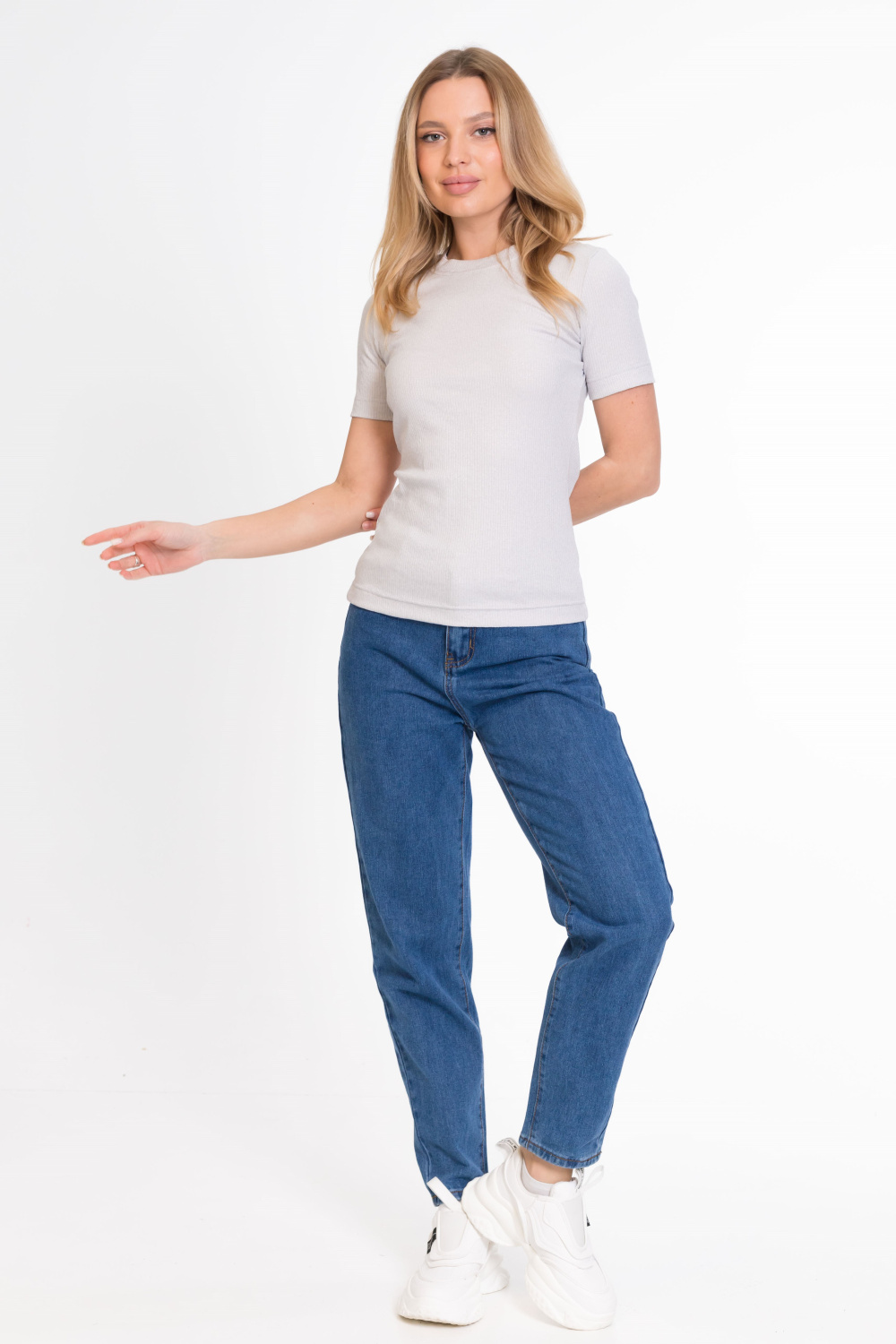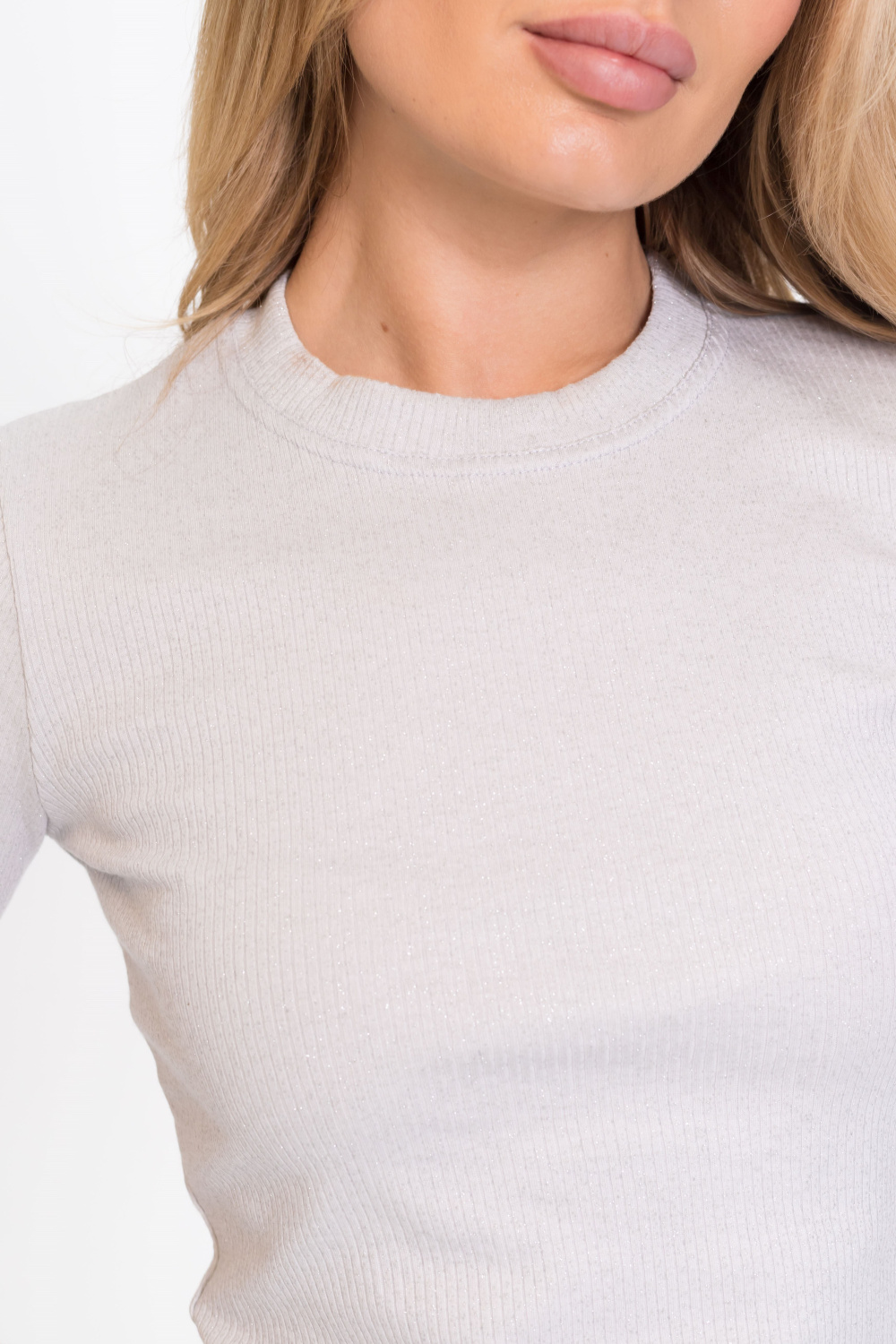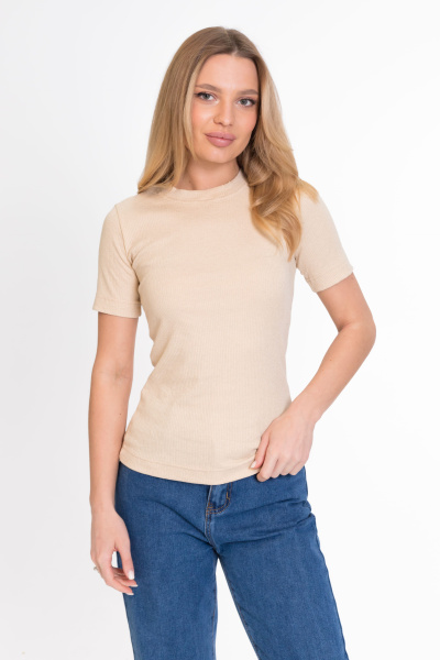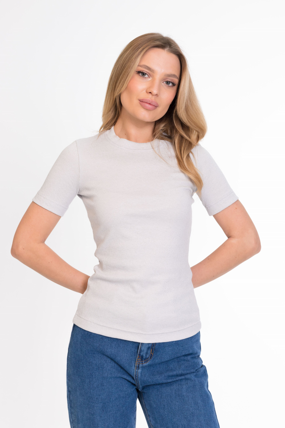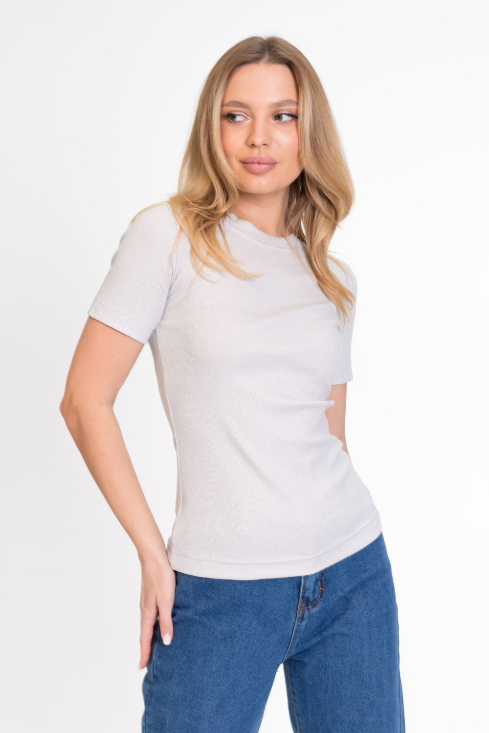 Женская футболка облегающего силуэта из кашкорсе с люрексом. Круглый вырез горловины, короткий облегающий рукав.