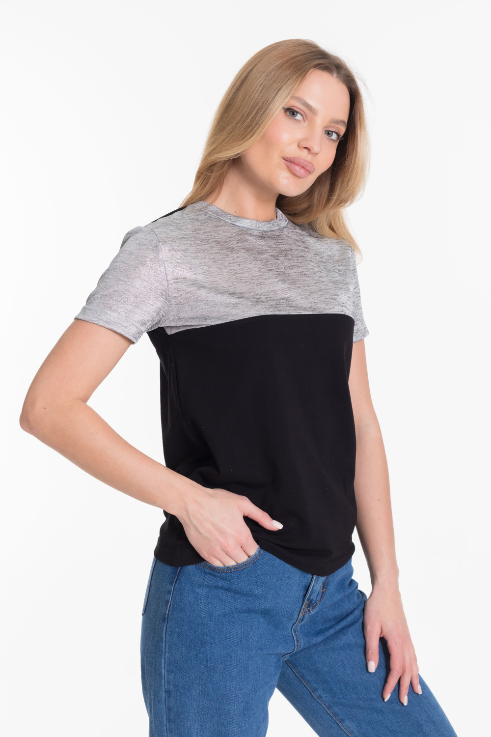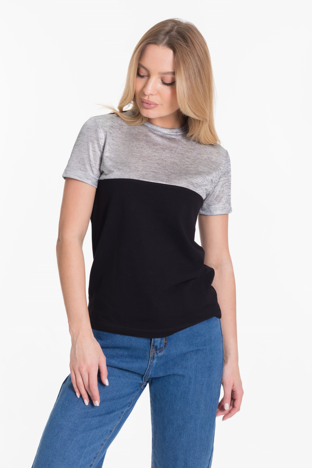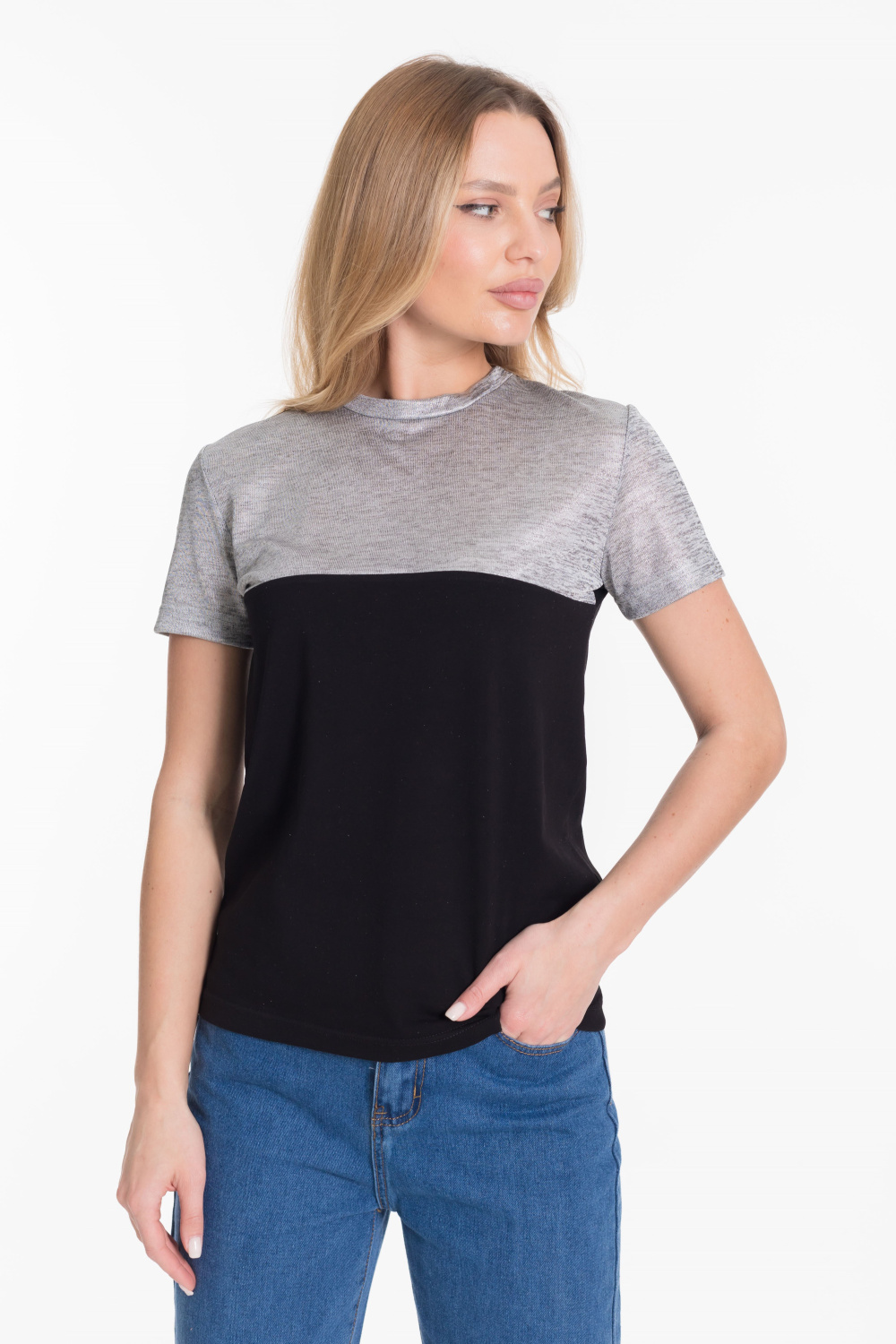 Футболка из двух видов ткани - кулирки с лайкрой и вискозы цвета напыления серебра.