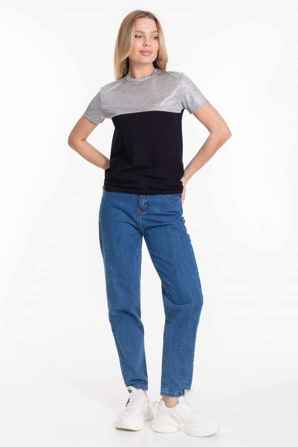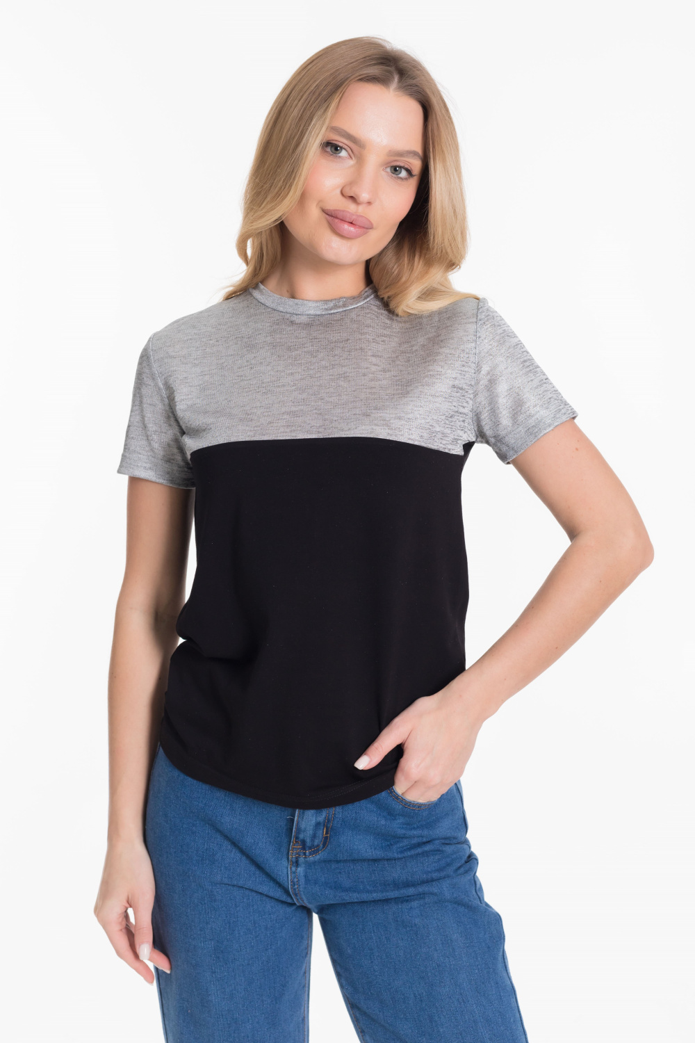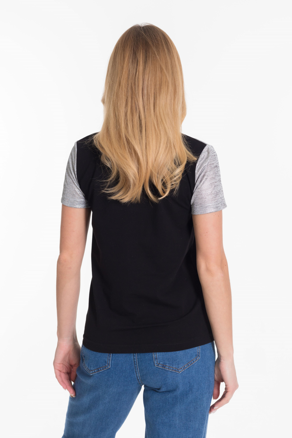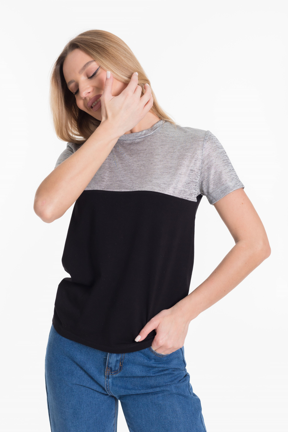 Футболка из двух видов ткани - кулирки с лайкрой и вискозы цвета напыления серебра.