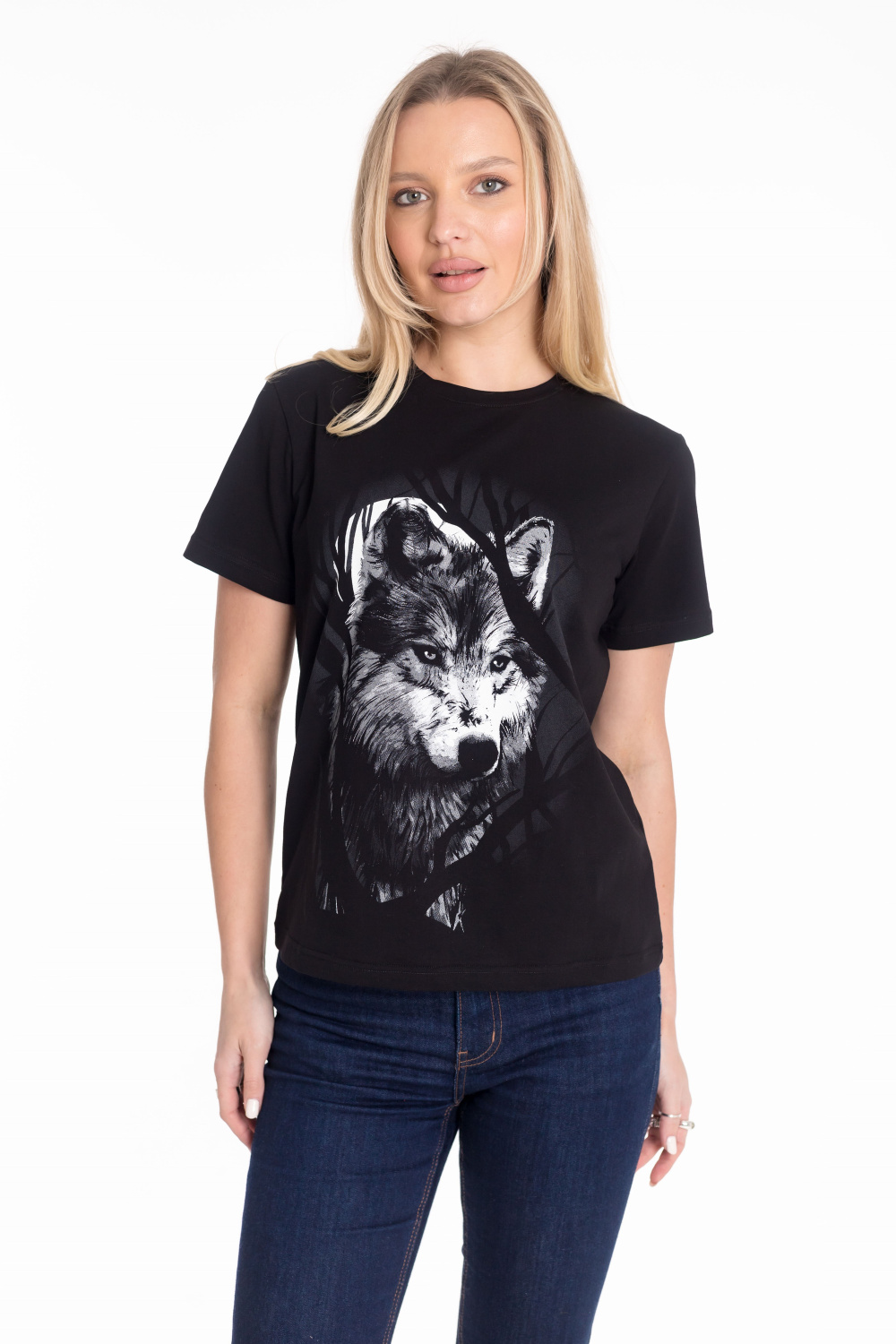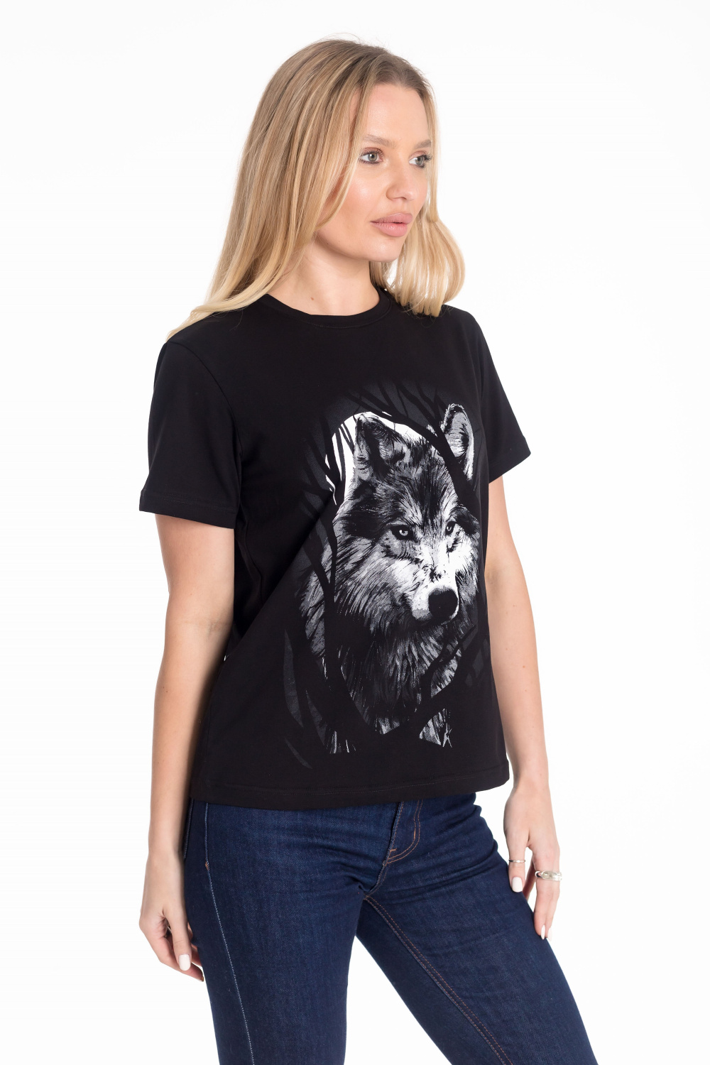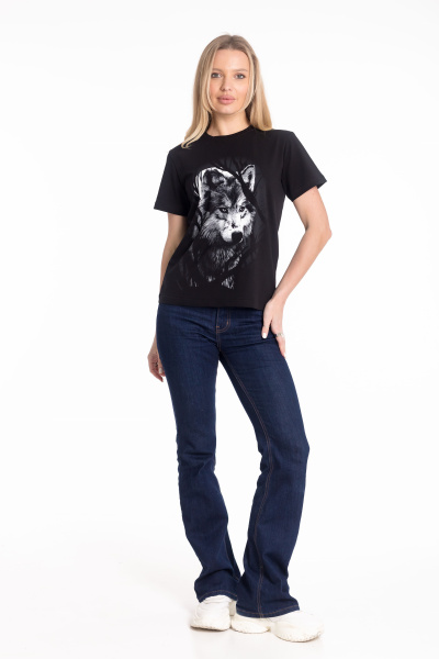 Женская футболка с эффектным принтом в виде волка выполнена из хлопкового полотна с добавлением лайкры, что обеспечивает комфорт, эластичность и хорошую воздухопроницаемость. Модель с коротким втачным рукавом и круглым вырезом горловины отличается лаконичным, но выразительным дизайном. Универсальный базовый чёрный цвет делает футболку идеальной основой для повседневных образов — она гармонично сочетается с джинсами, брюками или юбкой. Натуральный состав ткани обеспечивает комфорт и свободу движений в течение всего дня.